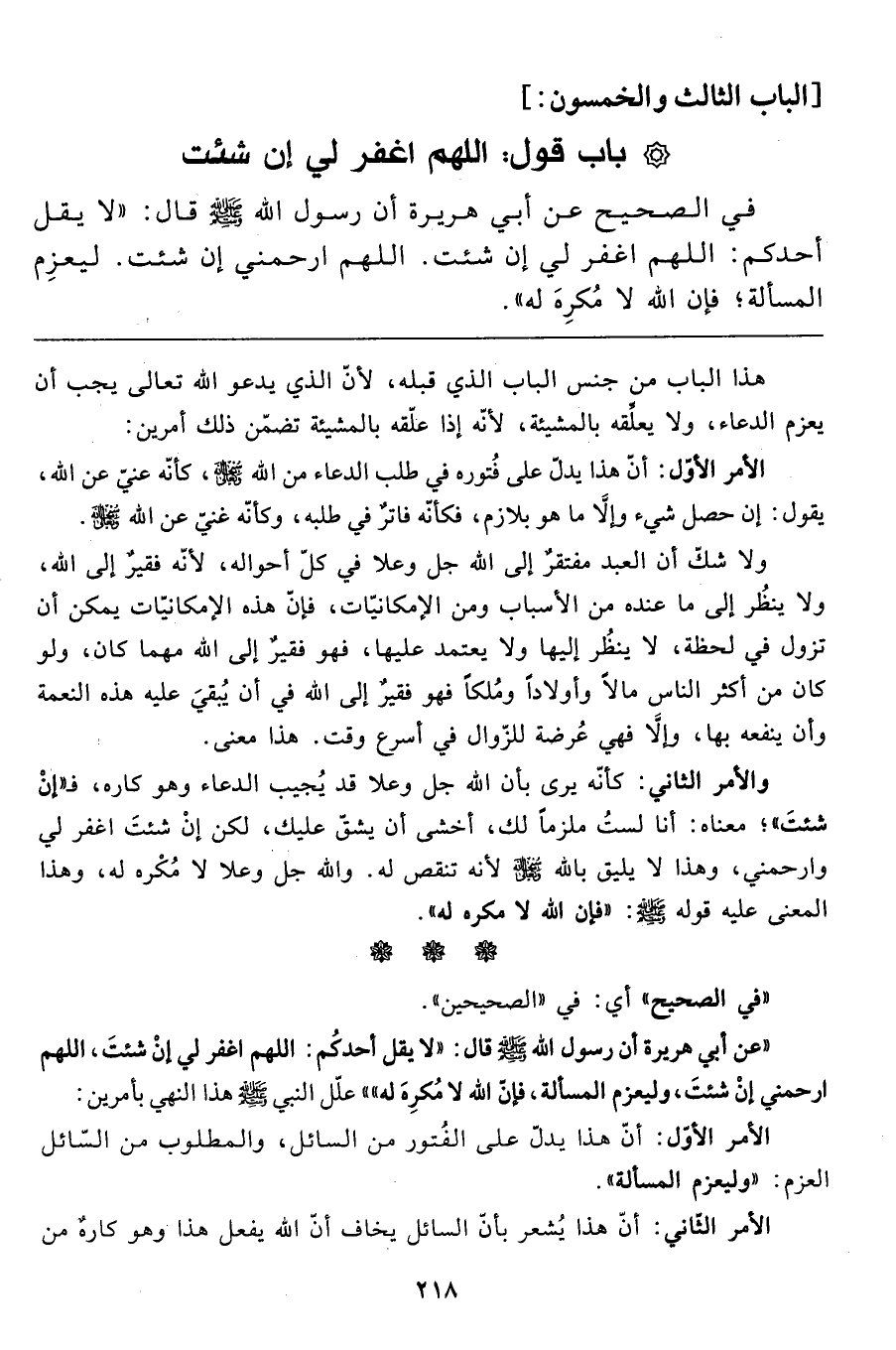 "عن أبي هريرة أن رسول الله صَلَّى اللَّهُ عَلَيْهِ وَسَلَّمَ قال: "لا يقل أحدكُم: اللهم اغفر لي إنْ شئتَ، اللهم ارحمني إنْ شئتَ، وليعزم المسألة، فإنّ الله لا مُكرِهَ له " علّل النّبي صَلَّى اللَّهُ عَلَيْهِ وَسَلَّمَ هذا النّهي بأمرين: الأمر الأوّل: أنّ هذا يدلّ على الفُتور من السائل، والمطلوب من السّائل العزم: "وليعزم المسألة".