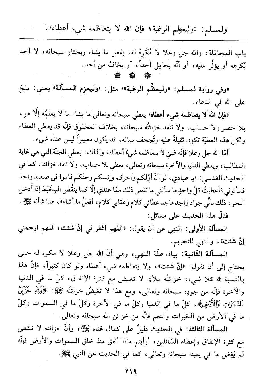 المسألة الثانية: بيان علّة النّهي، وهي أنّ الله جل وعلا لا مكره له حتى يحتاج إلى أن تقول: "إنْ شئت"، ولا يتعاظمه شيء أعطاه ولو كان كثيراً، فإنّ هذا بالنسبة لله كلا شيء، خزائنُه ملأى لا تغيض مع كثرة الإنفاق، كلّ ما في الدنيا والآخرة فإنّه من جودِه سبحانه وتعالى، ومع هذا لا تغيضُ خزائنُه سبحانه وتعالى: {وَلِلَّهِ خَزَائِنُ السَّمَاوَاتِ وَالْأَرْضِ} ، كلّ ما في الدنيا وكلّ ما في الآخرة وكلّ ما في السموات وكلّ ما في الأرض من الخيرات والنعم فإنّه من خزائن الله سبحانه وتعالى.