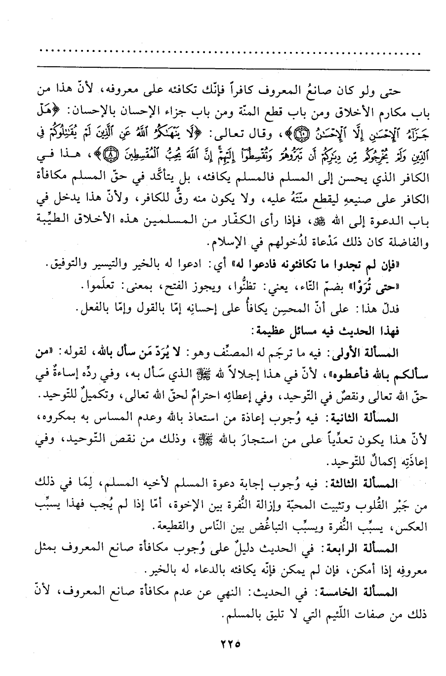 المسألة الخامسة: في الحديث: النّهي عن عدم مكافأة صانع المعروف، لأنّ ذلك من صفات اللّئيم التي لا تليق بالمسلم.