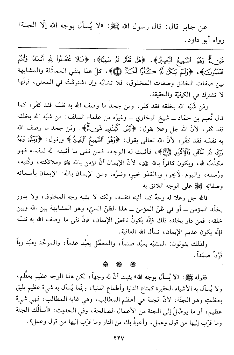 فقوله صَلَّى اللَّهُ عَلَيْهِ وَسَلَّمَ: "لا يُسأل بوجه الله" يثبت أنّ لله وجهاً، لكن هذا الوجه عظيم يعظَّم، ولا يُسأل به الأشياء الحقيرة كمتاع الدنيا وأطماع الدنيا، وإنّما يُسأل به شيءٌ عظيم يليق بعظمتِه وهو الجنّة، لأنّ الجنة هي أعظم المطالِب، وهي غاية المطالب، فهي شيءٌ عظيم، أو ما يوصِّلُ إلى الجنة من الأعمال الصالحة، وفي الحديث: "أسألُك الجنة وما قرّب إليها من قول وعمل، وأعوذ بك من النار وما قرّب إليها من قول وعمل".