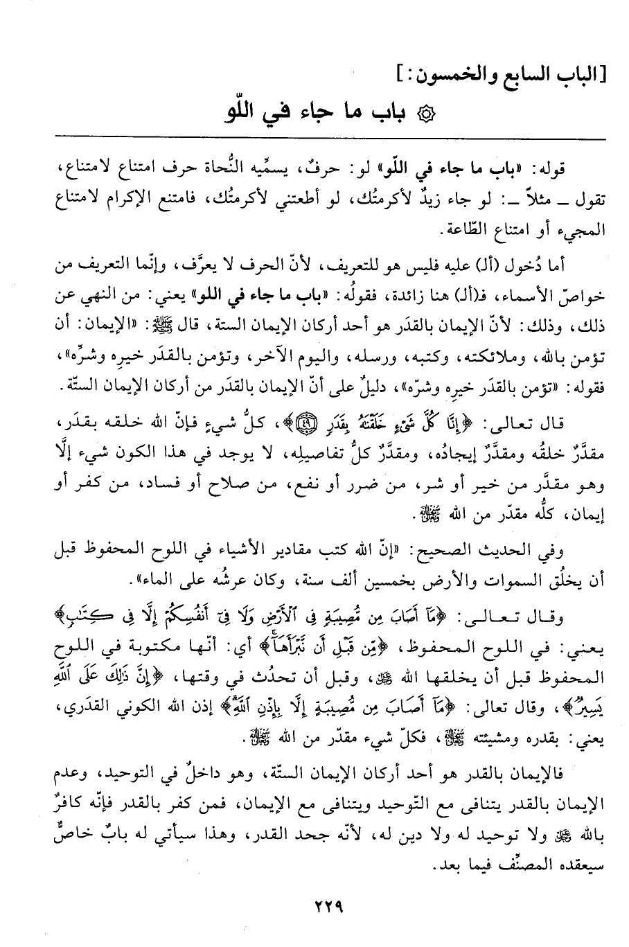 أما دُخول (ألـ) عليه فليس هو للتعريف، لأنّ الحرف لا يعرَّف، وإنّما التعريف من خواصّ الأسماء، فـ (ألـ) هنا زائدة، فقولُه: "باب ما جاء في اللو" يعني: من النّهي عن ذلك، وذلك: لأنّ الإيمان بالقدَر هو أحد أركان الإيمان الستة، قال صَلَّى اللَّهُ عَلَيْهِ وَسَلَّمَ: "الإيمان: أنّ تؤمن بالله، وملائكته، وكتبه، ورسله، واليوم الآخر، وتؤمن بالقدَر خيرِه وشرِّه"، فقوله: "تؤمن بالقدَر خيرِه وشرِّه"، دليلٌ على أنّ الإيمان بالقدَر من أركان الإيمان الستّة.