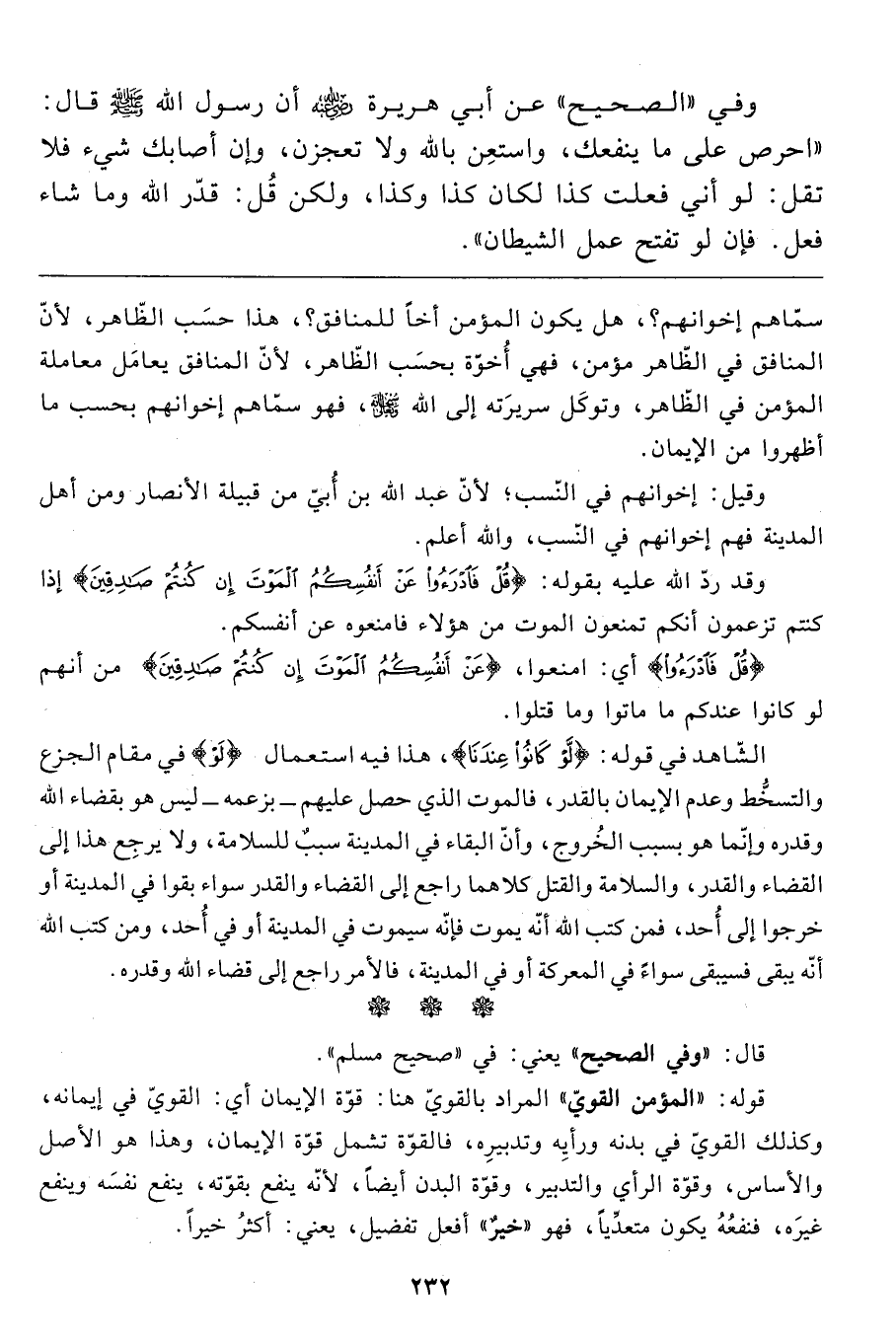 وفي "الصحيح" عن أبي هريرة رضي الله عنه أن رسول الله صَلَّى اللَّهُ عَلَيْهِ وَسَلَّمَ قال: "احرص على ما ينفعك، واستعِن بالله ولا تعجزن، وإن أصابك شيء فلا تقل: لو أني فعلت كذا لكان كذا وكذا، ولكن قُل: قدّر الله وما شاء فعل. فإن لو تفتح عمل الشيطان".