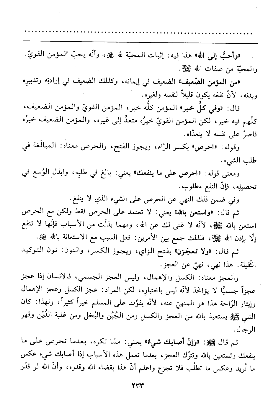 "من المؤمن الضّعيف" الضعيف في إيمانه، وكذلك الضعيف في إرادتِه وتدبيرِه وبدنه، لأنّ نفعَه يكون قليلاً لنفسه ولغيره.