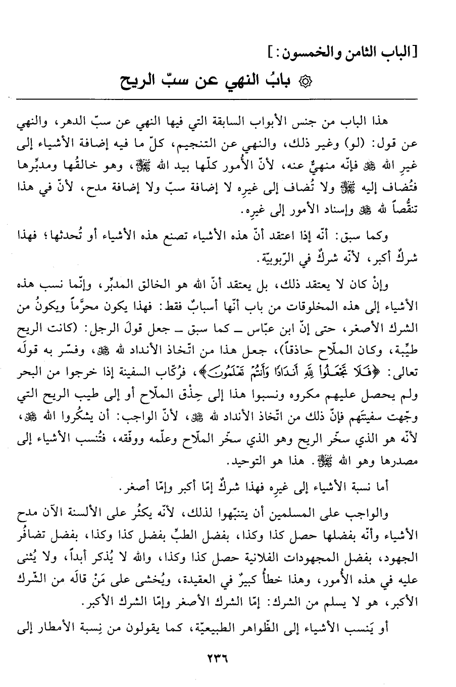 وإنْ كان لا يعتقد ذلك، بل يعتقد أنّ الله هو الخالق المدبِّر، وإنّما نسب هذه الأشياء إلى هذه المخلوقات من باب أنّها أسبابٌ فقط: فهذا يكون محرَّماً ويكونُ من الشرك الأصغر، حتى إنّ ابن عبّاس- كما سبق- جعل قولَ الرجل: "كانت الريح طيِّبة، وكان الملاّح حاذقاً"، جعل هذا من اتّخاذ الأنداد لله عزّ وجلّ، وفسّر به قولَه تعالى: {فَلا تَجْعَلُوا لِلَّهِ أَنْدَاداً وَأَنْتُمْ تَعْلَمُونَ} ، فرُكّاب السفينة إذا خرجوا من البحر ولم يحصل عليهم مكروه ونسبوا هذا إلى حِذْق الملاّح أو إلى طيب الريح التي وجّهت سفينتَهم فإنّ ذلك من اتّخاذ الأنداد لله عزّ وجلّ، لأنّ الواجب: أن يشكُروا الله عزّ وجلّ، لأنّه هو الذي سخّر الريح وهو الذي سخّر الملاّح وعلّمه ووفّقه، فتُنسب الأشياء إلى مصدرها وهو الله سبحانه وتعالى. هذا هو التّوحيد.