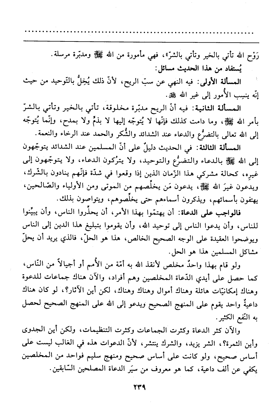المسألة الأولى: فيه النّهي عن سبّ الريح، لأنّ ذلك يُخِلُّ بالتّوحيد من حيث إنّه ينسِب الأُمور إلى غير الله عزّ وجلّ.