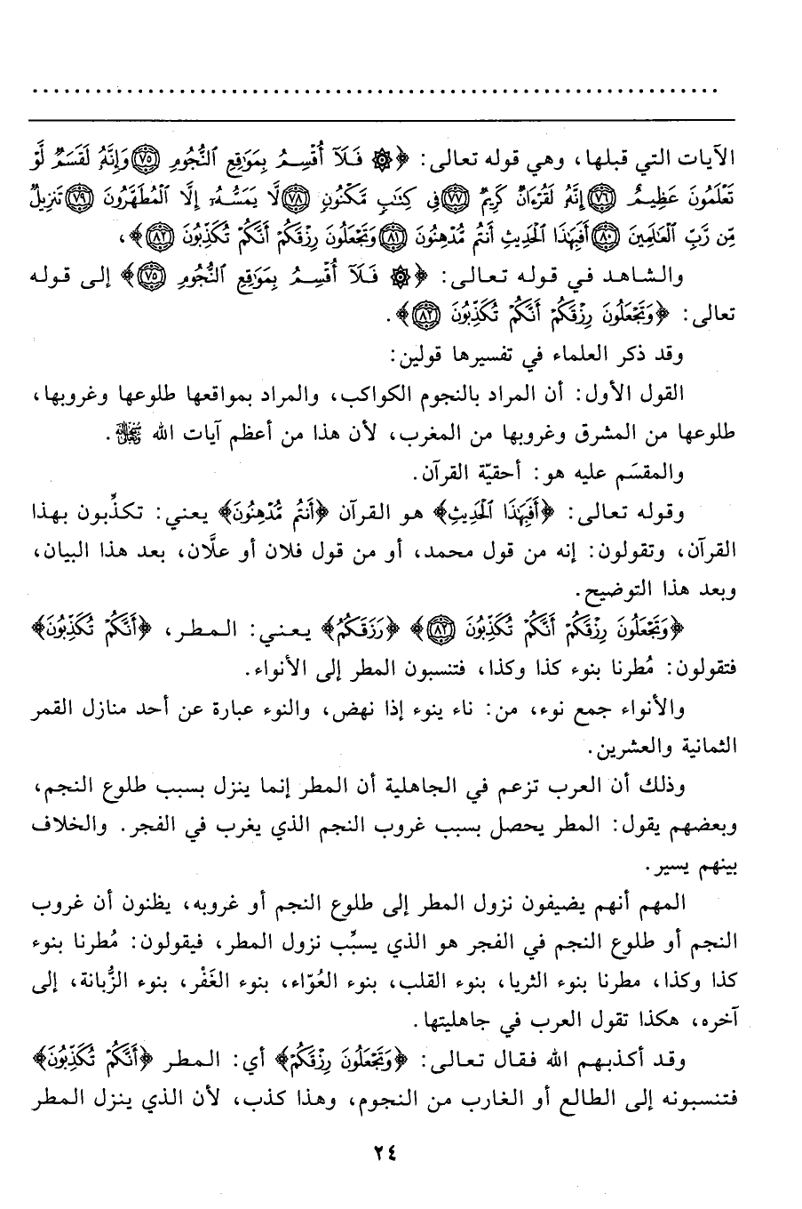 {وَتَجْعَلُونَ رِزْقَكُمْ أَنَّكُمْ تُكَذِّبُونَ (82) } {رِزْقَكُمْ} يعني: المطر، {أَنَّكُمْ تُكَذِّبُونَ} فتقولون: مُطرنا بنوء كذا وكذا، فتنسبون المطر إلى الأنواء.