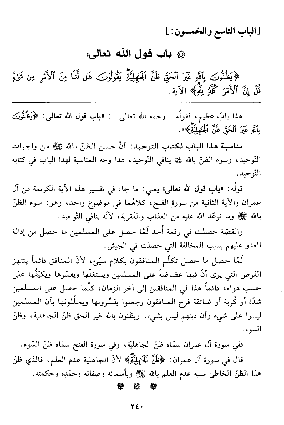 {يَظُنُّونَ بِاللهِ غَيْرَ الْحَقِّ ظَنَّ الْجَاهِلِيَّةِ يَقُولُونَ هَلْ لَنَا مِنَ الْأَمْرِ مِنْ شَيْءٍ قُلْ إِنَّ الْأَمْرَ كُلَّهُ لِلَّهِ} الآية.