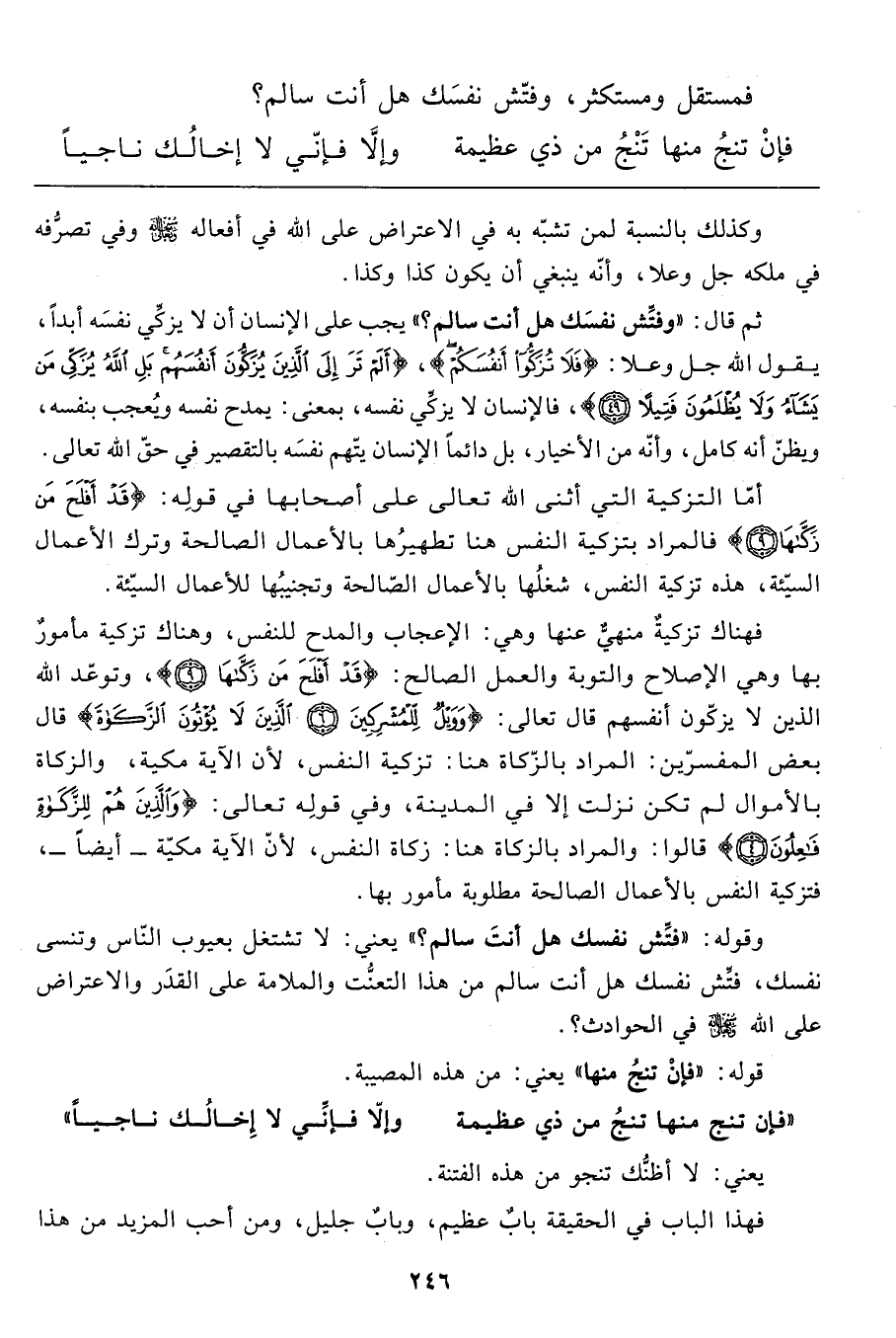 ثم قال: "وفتِّش نفسَك هل أنت سالم؟ " يجب على الإنسان أن لا يزكِّي نفسه أبداً، يقول الله جل وعلا: {فَلا تُزَكُّوا أَنْفُسَكُمْ} ، {أَلَمْ تَرَ إِلَى الَّذِينَ يُزَكُّونَ أَنْفُسَهُمْ بَلِ اللهُ يُزَكِّي مَنْ يَشَاءُ وَلا يُظْلَمُونَ فَتِيلاً (49) } ، فالإنسان لا يزكِّي نفسه، بمعنى: يمدح نفسه ويُعجب بنفسه، ويظنّ أنه كامل، وأنّه من الأخيار، بل دائماً الإنسان يتّهم نفسَه بالتقصير في حقّ الله تعالى.