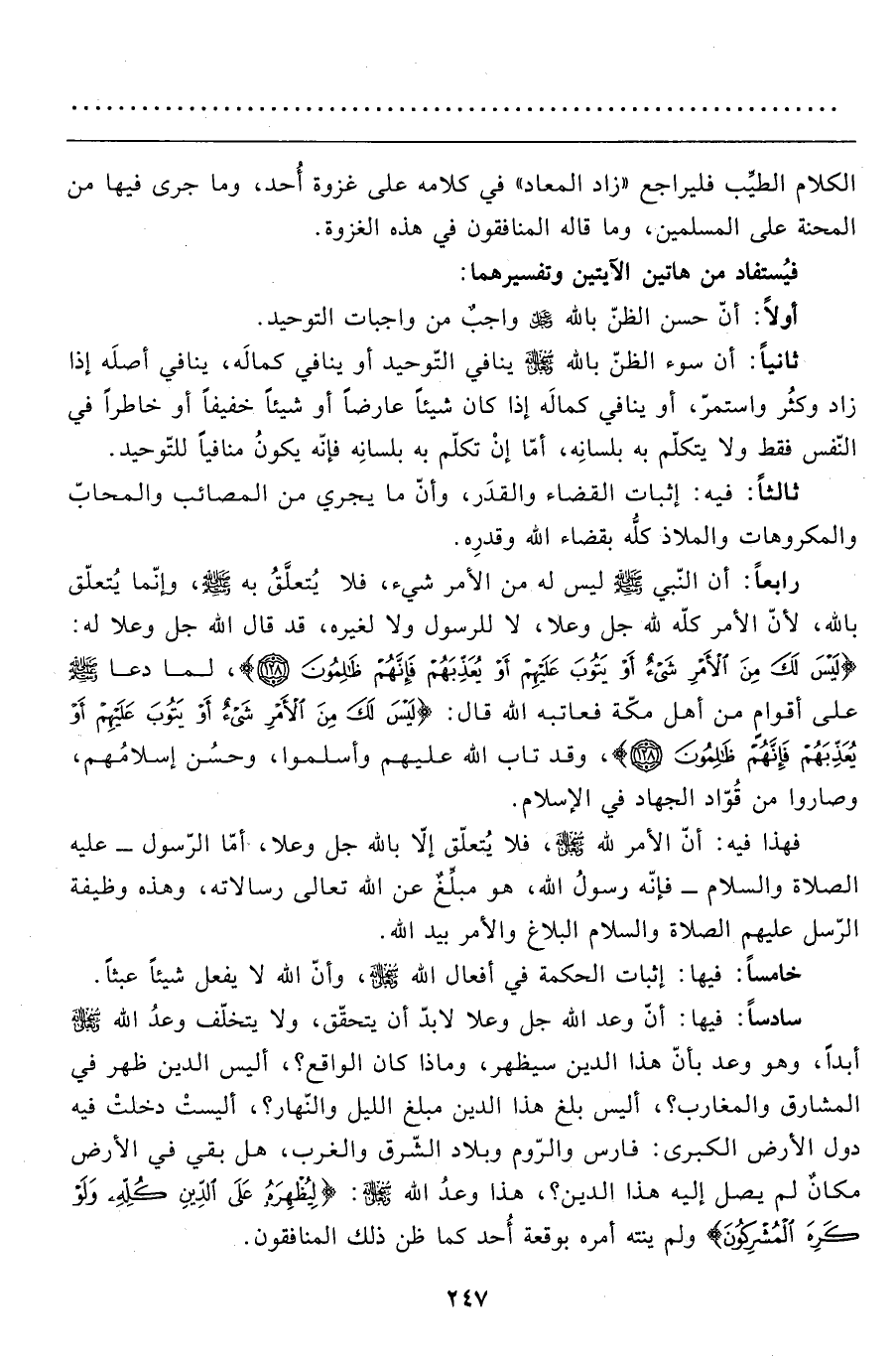 سادساً: فيها: أنّ وعد الله جل وعلا لابدّ أن يتحقّق، ولا يتخلّف وعدُ الله سبحانه وتعالى أبداً، وهو وعد بأنّ هذا الدين سيظهر، وماذا كان الواقع؟، أليس الدين ظهر في المشارق والمغارب؟، أليس بلغ هذا الدين مبلغ الليل والنّهار؟، أليستْ دخلتْ فيه دول الأرض الكبرى: فارس والرّوم وبلاد الشّرق والغرب، هل بقي في الأرض مكان لم يصل إليه هذا الدين؟، هذا وعد الله عزّ وجلّ: {لِيُظْهِرَهُ عَلَى الدِّينِ كُلِّهِ وَلَوْ كَرِهَ الْمُشْرِكُونَ} ولم ينته أمره بوقعة أحد كما ظن ذلك المنافقون.