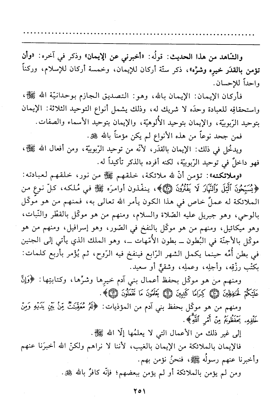 والشّاهد من هذا الحديث: قولُه: "أخبرني عن الإيمان" وذكر في آخره: "وأن تؤمن بالقدَر خيرِه وشرَّه"، ذكر ستّة أركان للإيمان، وخمسة أركان للإسلام، وركناً واحداً للإحسان.