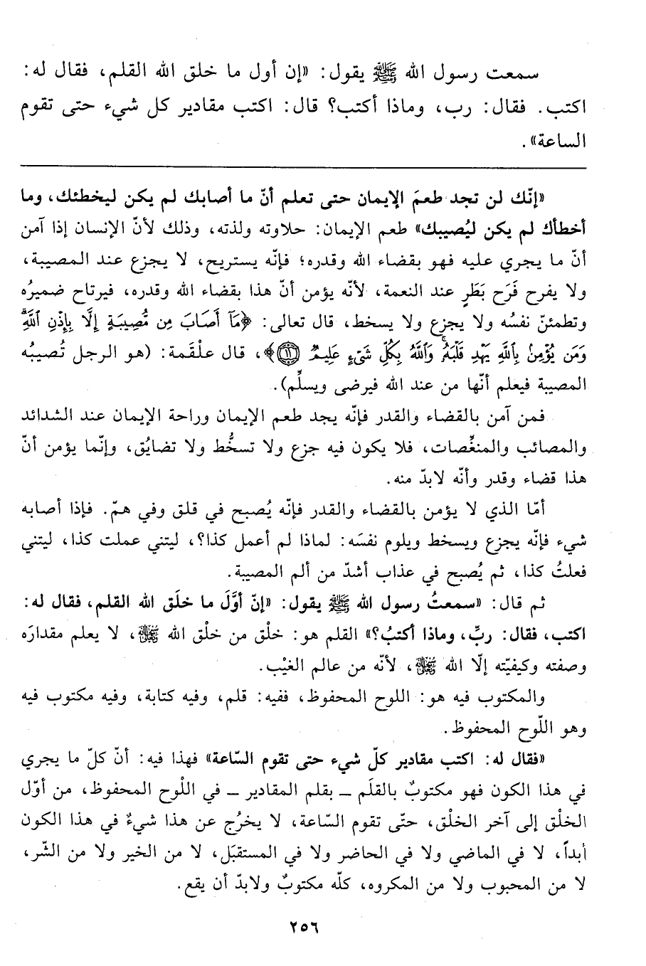"إنّك لن تجد طعم الإيمان حتى تعلم أنّ ما أصابك لم يكن ليخطئك، وما أخطأك لم يكن ليُصيبك" طعم الإيمان: حلاوته ولذته، وذلك لأنّ الإنسان إذا آمن أنّ ما يجري عليه فهو بقضاء الله وقدره؛ فإنّه يستريح، لا يجزع عند المصيبة، ولا يفرح فَرَح بَطَرٍ عند النعمة، لأنّه يؤمن أنّ هذا بقضاء الله وقدره، فيرتاح ضميرُه وتطمئنّ نفسُه ولا يجزع ولا يسخط، قال تعالى: {مَا أَصَابَ مِنْ مُصِيبَةٍ إِلَّا بِإِذْنِ اللهِ وَمَنْ يُؤْمِنْ بِاللهِ يَهْدِ قَلْبَهُ وَاللهُ بِكُلِّ شَيْءٍ عَلِيمٌ (11) } ، قال علقَمة: "هو الرجل تُصيبه المصيبة فيعلم أنّها من عند الله فيرضى ويسلِّم".