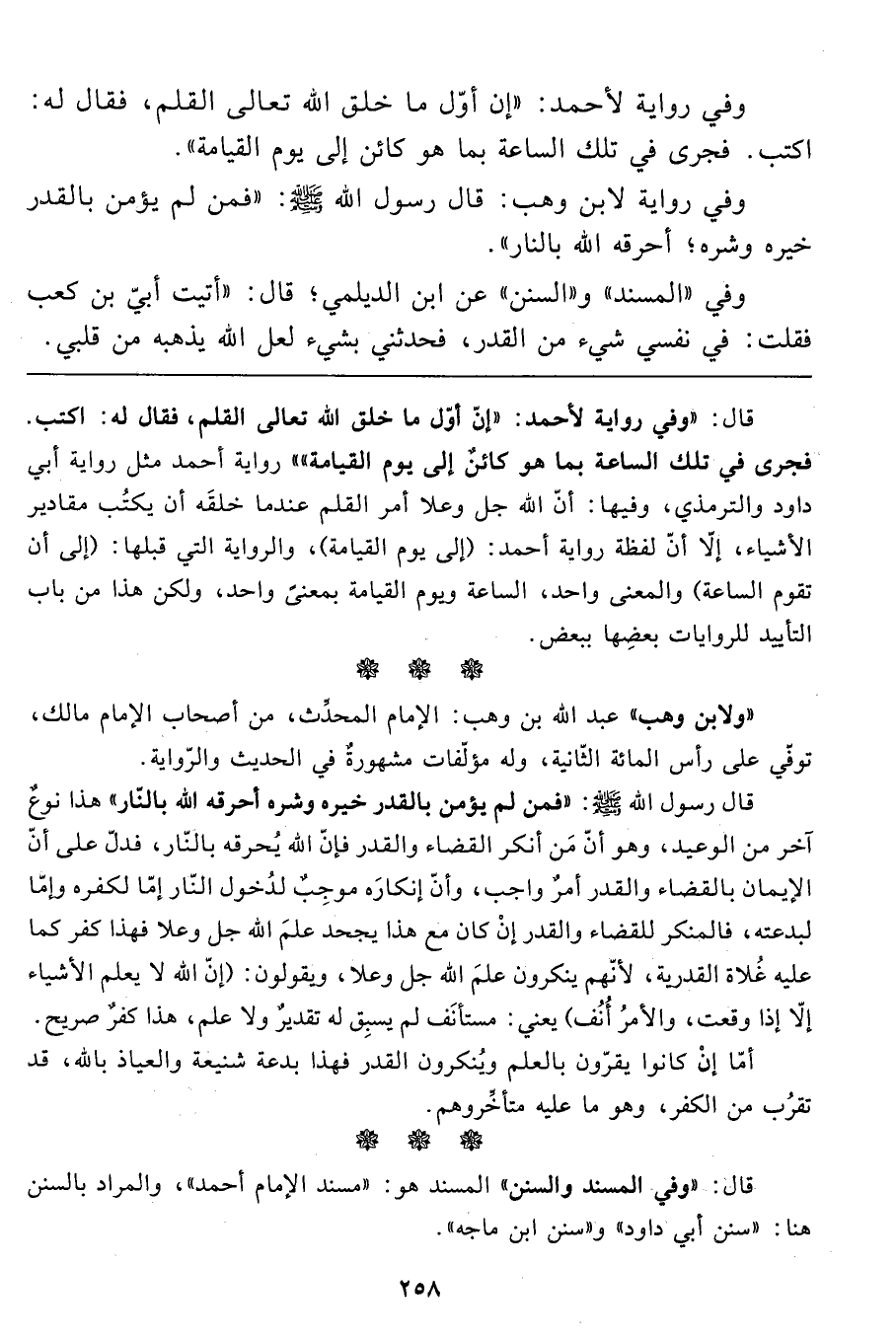 وفي رواية لابن وهب: قال رسول الله صَلَّى اللَّهُ عَلَيْهِ وَسَلَّمَ: "فمن لم يؤمن بالقدر خيره وشره؛ أحرقه الله بالنار".