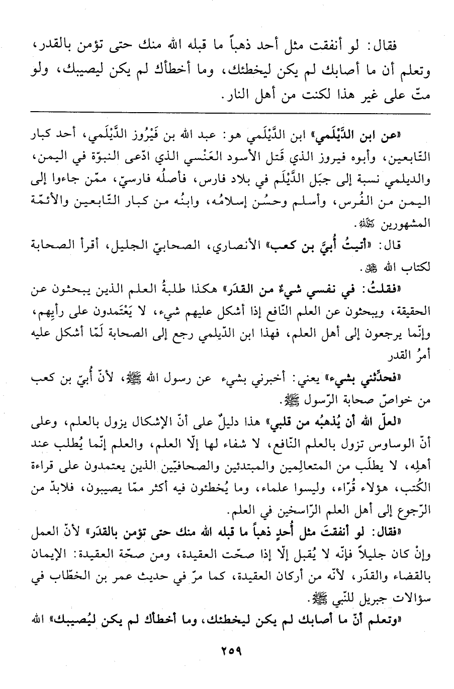 "فقلتُ: في نفسي شيءٌ من القدَر" هكذا طلبةُ العلم الذين يبحثون عن الحقيقة، ويبحثون عن العلم النّافع إذا أشكل عليهم شيء، لا يَعْتَمدون على رأيِهم، وإنّما يرجعون إلى أهل العلم، فهذا ابن الدّيلمي رجع إلى الصّحابة لَمّا أشكل عليه أمرُ القدر.