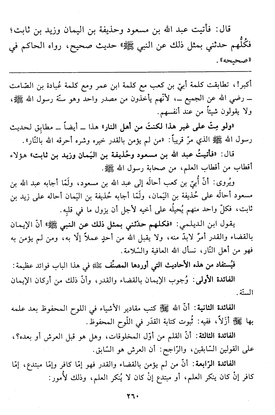 الفائدة الرابعة: أنّ من لم يؤمن بالقضاء والقدر فهو إمّا كافر وإمّا مبتدع، إمّا كافر إنْ كان ينكر العلم، أو مبتدع إنْ كان لا يُنكر العلم، وذلك لأُمور:
