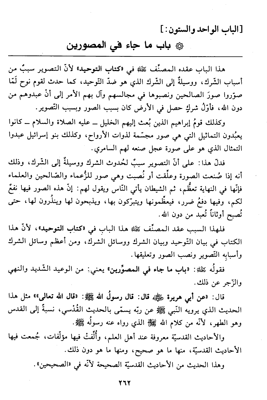 هذا الباب عقده المصنِّف رحمه الله في "كتاب التّوحيد" لأنّ التصوير سببٌ من أسباب الشّرك، ووسيلةٌ إلى الشّرك الذي هو ضدّ التّوحيد، كما حدث لقوم نوح لَمّا صوّروا صور الصالحين ونصبوها في مجالسهم وآل بهم الأمر إلى أنْ عبدوهم من دون الله، فأوّلُ شركٍ حصل في الأرض كان بسبب الصور وبسبب التّصوير.