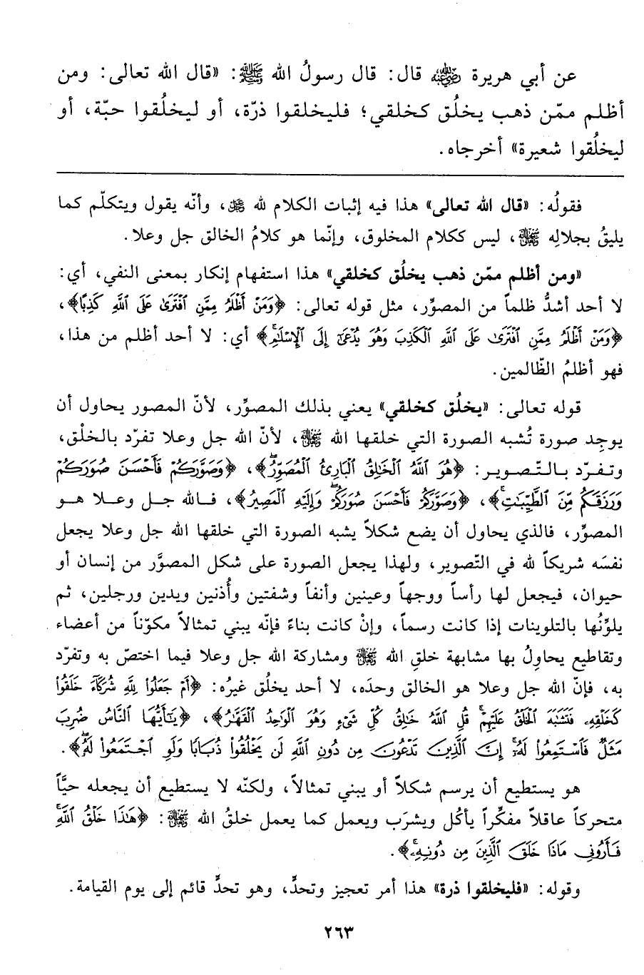 عن أبي هريرة رضي الله عنه قال: قال رسول الله صَلَّى اللَّهُ عَلَيْهِ وَسَلَّمَ: "قال الله تعالى: ومن أظلم ممّن ذهب يخلُق كخلقي؛ فليخلقوا ذرّة، أو ليخلُقوا حبّة، أو ليخلُقوا شعيرة" أخرجاه.
