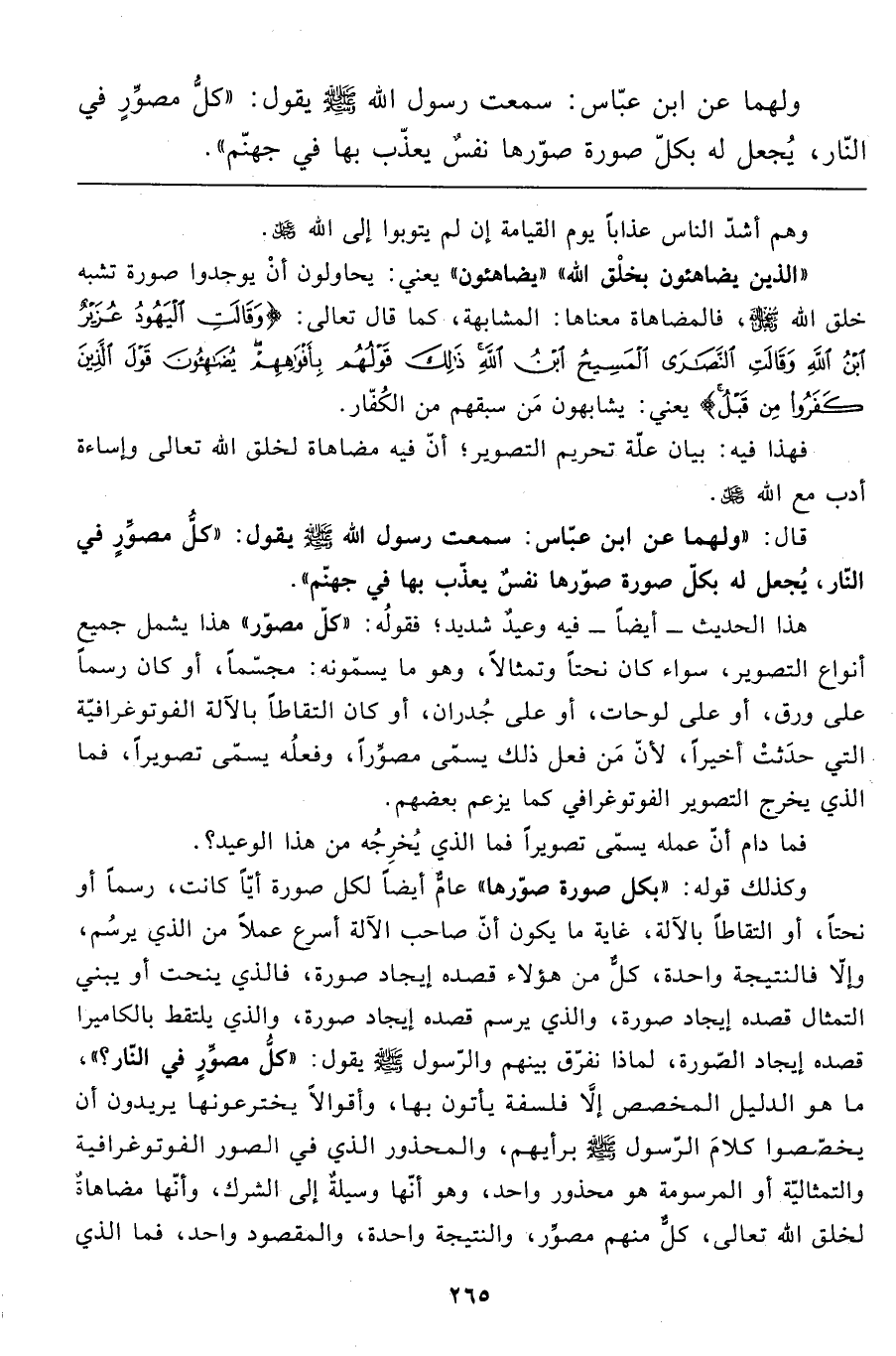 وكذلك قوله: "بكل صورة صوّرها" عامٌّ أيضاً لكل صورة أيًّا كانت، رسماً أو نحتاً، أو التقاطاً بالآلة، غاية ما يكون أنّ صاحب الآلة أسرع عملاً من الذي يرسُم، وإلا فالنتيجة واحدة، كلٌّ من هؤلاء قصده إيجاد صورة، فالذي ينحت أو يبني التمثال قصده إيجاد صورة، والذي يرسم قصده إيجاد صورة، والذي يلتقط بالكاميرا قصده إيجاد الصّورة، لماذا نفرّق بينهم والرّسول صَلَّى اللَّهُ عَلَيْهِ وَسَلَّمَ يقول: "كلُّ مصوِّرٍ في النّار؟ "، ما هو الدليل المخصص إلاّ فلسفة يأتون بها، وأقوالاً يخترعونها يريدون أن يخصّصوا كلام الرّسول صَلَّى اللَّهُ عَلَيْهِ وَسَلَّمَ برأيهم، والمحذور الذي في الصور الفوتوغرافية والتمثاليّة أو المرسومة هو محذور واحد، وهو أنّها وسيلةٌ إلى الشرك، وأنّها مضاهاةٌ لخلق الله تعالى، كلٌّ منهم مصوِّر، والنتيجة واحدة، والمقصود واحد، فما الذي