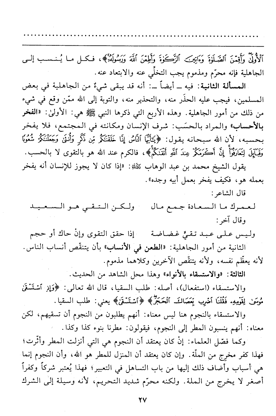 المسألة الثانية: فيه- أيضاً-: أنه قد يبقى شيءٌ من الجاهلية في بعض المسلمين، فيجب عليه الحذَر منه، والتحذير منه، والتوبة إلى الله ممّن وقع في شيء من ذلك من أمور الجاهلية. وهذه الأربع التي ذكرها النبي صَلَّى اللَّهُ عَلَيْهِ وَسَلَّمَ هي: الأولى: "الفخر بالأحساب" والمراد بالحسَب: شرف الإنسان ومكانته في المجتمع، فلا يفخر بحسبه، لأن الله سبحانه يقول: {يَا أَيُّهَا النَّاسُ إِنَّا خَلَقْنَاكُمْ مِنْ ذَكَرٍ وَأُنْثَى وَجَعَلْنَاكُمْ شُعُوباً وَقَبَائِلَ لِتَعَارَفُوا إِنَّ أَكْرَمَكُمْ عِنْدَ اللهِ أَتْقَاكُمْ} ، فالكرم عند الله هو بالتقوى لا بالحسب.
