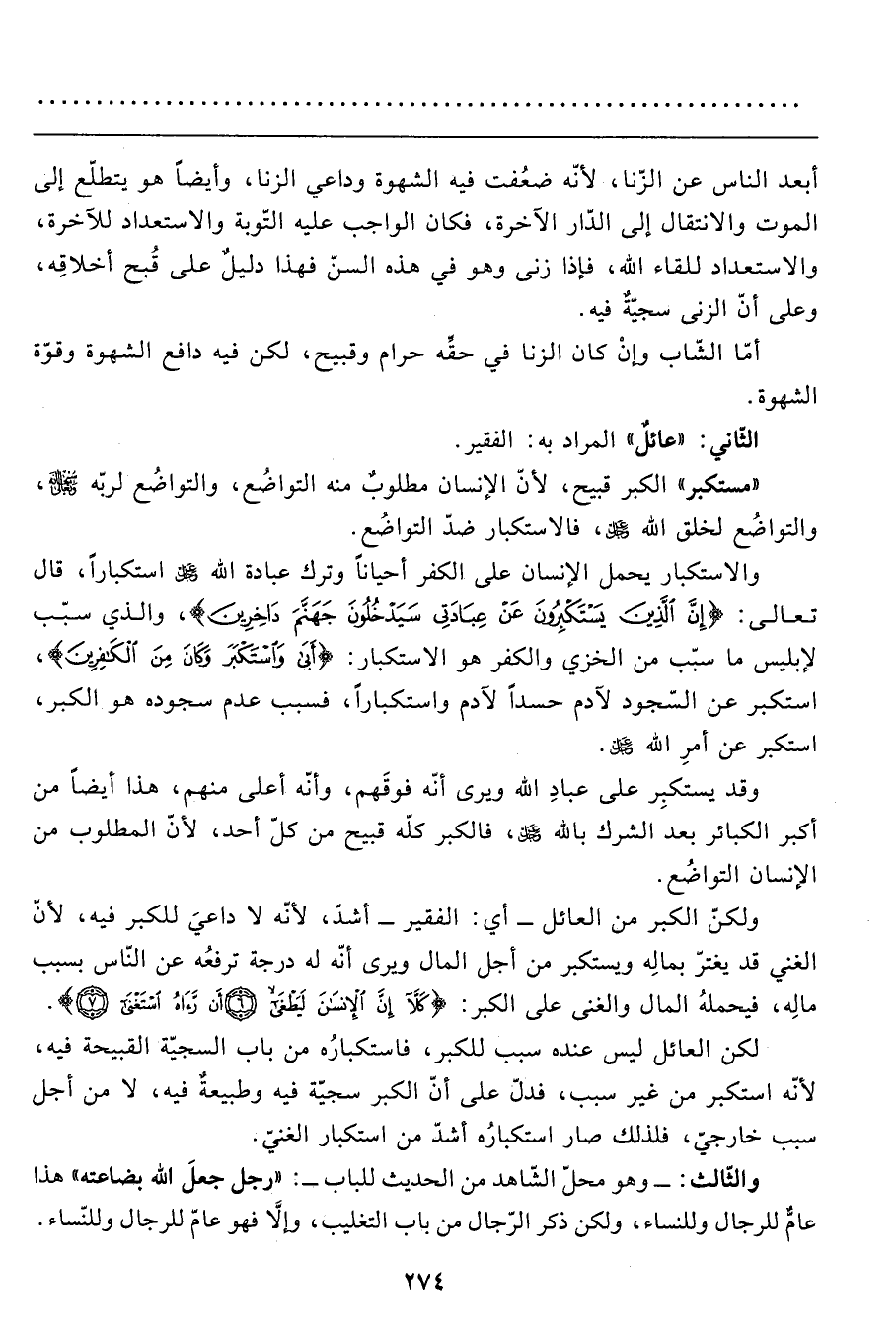 ولكنّ الكبر من العائل- أي: الفقير- أشدّ، لأنّه لا داعي للكبر فيه، لأنّ الغني قد يغترّ بمالِه ويستكبر من أجل المال ويرى أنّه له درجة ترفعُه عن النّاس بسبب مالِه، فيحملهُ المال والغنى على الكبر: {كَلَّا إِنَّ الْأِنْسَانَ لَيَطْغَى (6) أَنْ رَآهُ اسْتَغْنَى) (7) } .