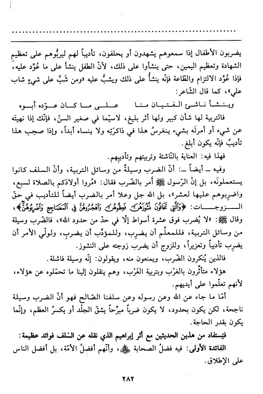 وفيه- أيضاً-: أنّ الضرب وسيلةٌ من وسائل التربية، وأنّ السلف كانوا يستعملونَه، بل إنّ الرّسول صَلَّى اللَّهُ عَلَيْهِ وَسَلَّمَ أَمر بالضّرب فقال: "مُروا أولادكم بالصلاة لسبع، واضرِبوهم عليها لعشر"، بل الله جل وعلا أمر بالضرب أيضاً للتأديب في حقّ الزوجات: {وَاللَّاتِي تَخَافُونَ نُشُوزَهُنَّ فَعِظُوهُنَّ وَاهْجُرُوهُنَّ فِي الْمَضَاجِعِ وَاضْرِبُوهُنَّ} ، وقال صَلَّى اللَّهُ عَلَيْهِ وَسَلَّمَ: "لا يُضرب فوق عشرة أسواط إلاّ في حدّ من حدود الله"، فالضّرب وسيلة من وسائل التربية، فللمعلِّم أن يضرب، وللمؤدِّب أن يضرب، ولولّي الأمر أن يضرب تأديباً وتعزيراً، وللزوج أن يضرب زوجته على النشور.