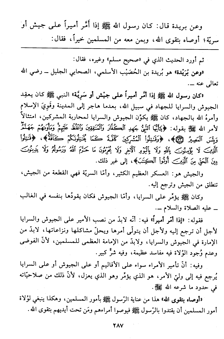 وعن بريدة قال: كان رسول الله صَلَّى اللَّهُ عَلَيْهِ وَسَلَّمَ إذا أَمَّر أميراً على جيش أو سريّة؛ أوصاه بتقوى الله، وبمن معه من المسلمين خيراً، فقال: