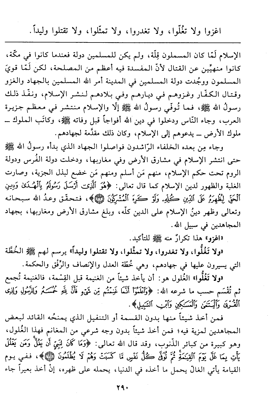 "ولا تَغُلُّوا، ولا تغدروا، ولا تمثِّلوا، ولا تقتلوا وليداً" يرسم لهم صَلَّى اللَّهُ عَلَيْهِ وَسَلَّمَ الخُطَّة التي يسيرون عليها في جهادهم، وهي خُطّة العدل والإنصاف والرِّفْق والحكمة.
