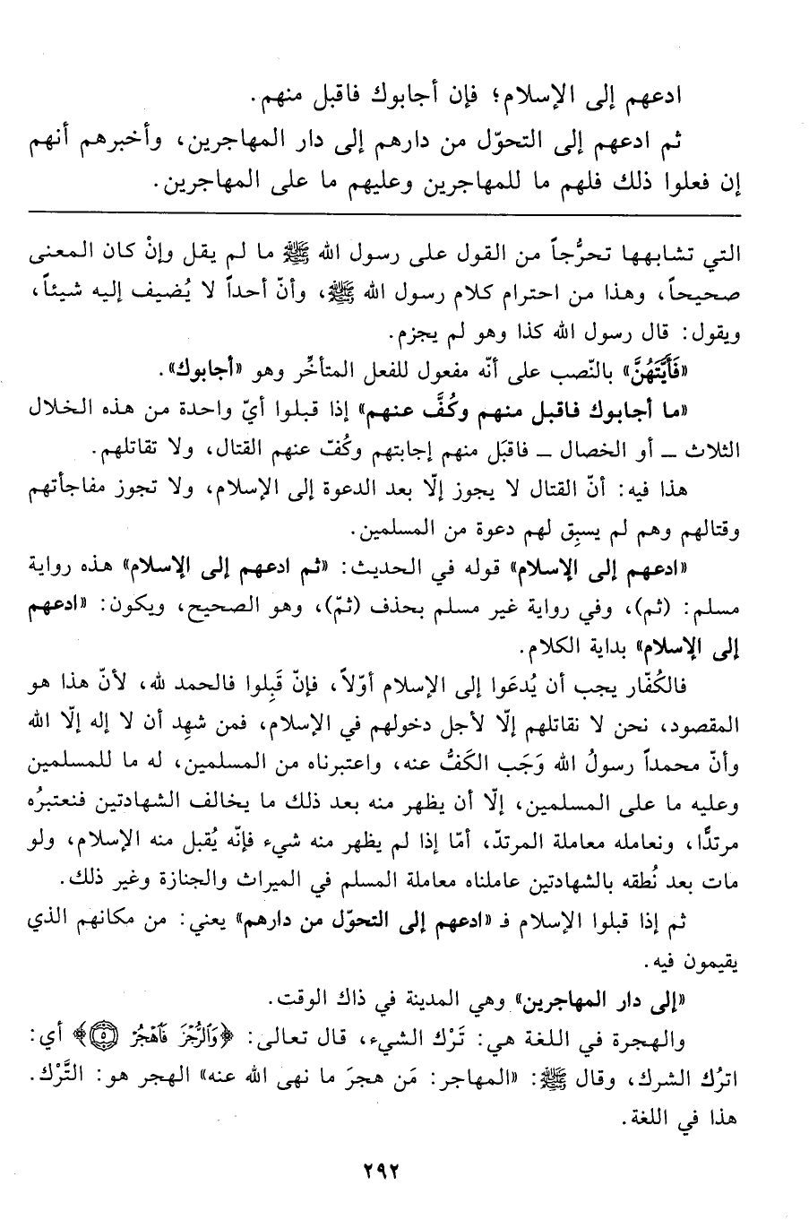 ادعهم إلى الإسلام؛ فإن أجابوك فاقبل منهم. ثم ادعهم إلى التحوّل من دارهم إلى دار المهاجرين، وأخبرهم أنهم إن فعلوا ذلك فلهم ما للمهاجرين وعليهم ما على المهاجرين.