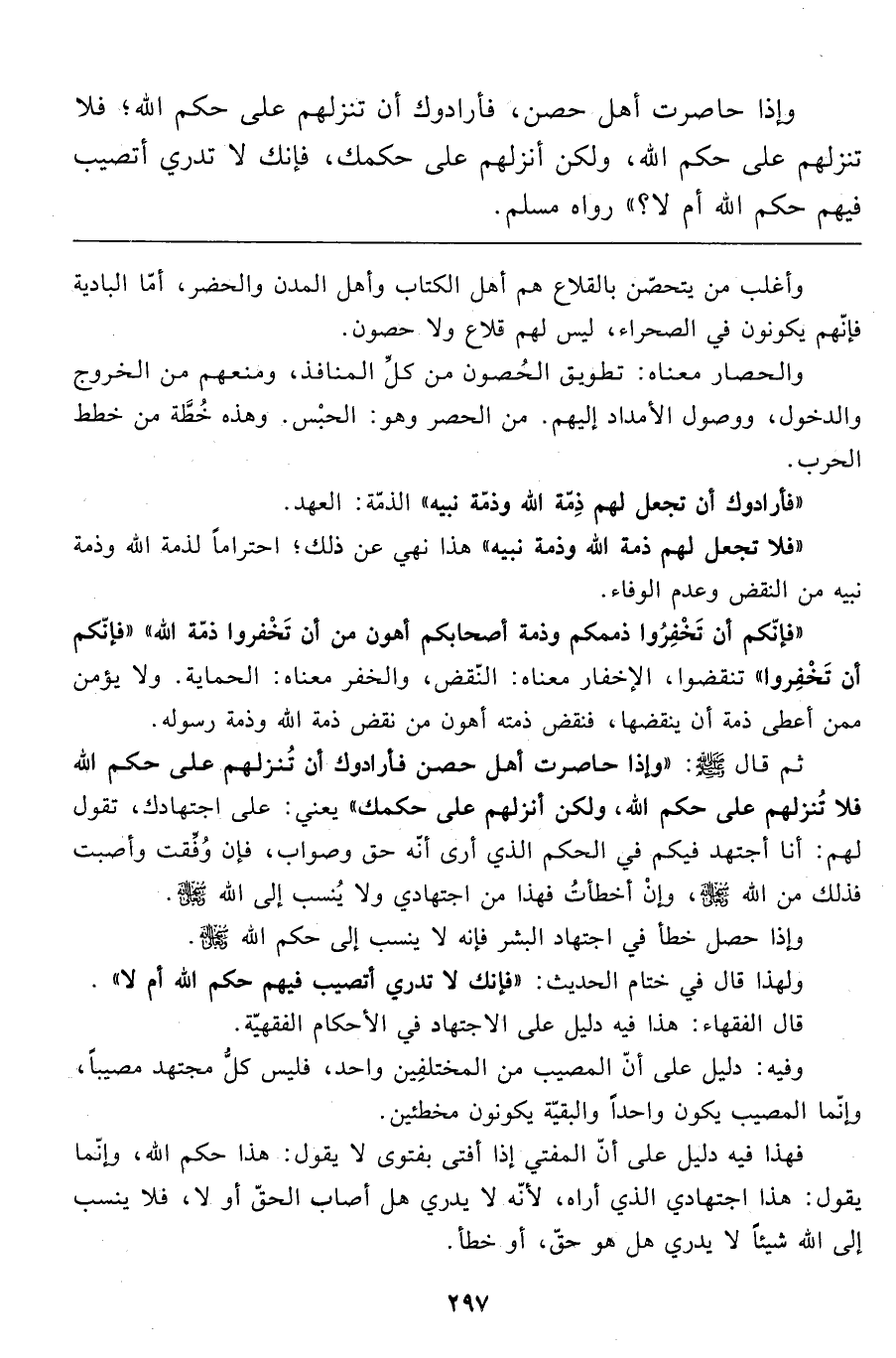 ثم قال صَلَّى اللَّهُ عَلَيْهِ وَسَلَّمَ: "وإذا حاصرت أهل حصن فأرادوك أن تُنزلهم على حكم الله فلا تُنزلهم على حكم الله، ولكن أنزلهم على حكمك" يعني: على اجتهادك، تقول لهم: أنا أجتهد فيكم فرب الحكم الذي أرى أنّه حق وصواب، فإن وُفِّقت وأصبت فذلك من الله سبحانه وتعالى، وإنْ أخطأتُ فهذا من اجتهادي ولا يُنسب إلى الله سبحانه وتعالى.