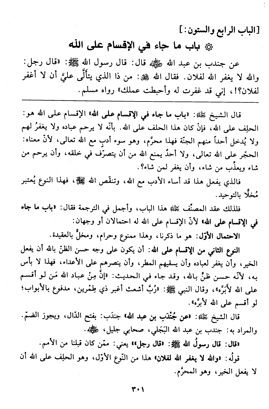 قال الشيخ رحمه الله: "باب ما جاء في الإقسام على الله" الإقسام على الله هو: الحلف على الله، فإن كان هذا الحلف على الله. بأنّه لا يرحم عباده ولا يغفرُ لهم ولا يُدخل أحداً منهم الجنّة فهذا محرَّم، وهو سوء أدبٍ مع الله تعالى، لأنّ معناه: الحجّر على الله تعالى، ولا أحدٌ يمنع الله من أن يتصرّف في خلقه، وأن يرحم من شاء ويعذِّب من شاء، وأن يغفر لمن شاء؟.