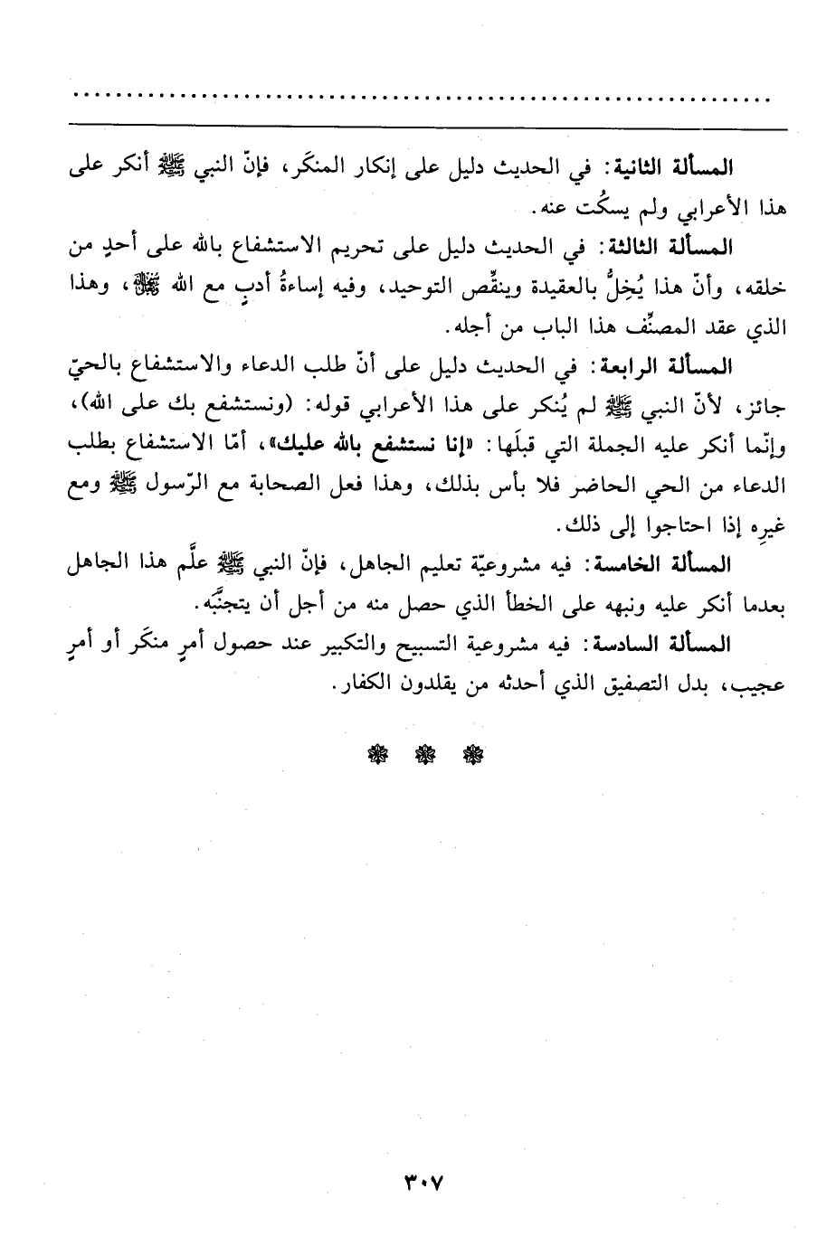 المسألة الرابعة: في الحديث دليل على أنّ طلب الدعاء والاستشفاع بالحيّ جائز، لأنّ النّبي صَلَّى اللَّهُ عَلَيْهِ وَسَلَّمَ لم يُنكر على هذا الأعرابي قوله: (ونستشفع بك على الله) ، وإنّما أنكر عليه الجملة التي قبلَها: "إنا نستشفع بالله عليك"، أمّا الاستشفاع بطلب الدعاء من الحي الحاضر فلا بأس بذلك، وهذا فعل الصّحابة مع الرّسول صَلَّى اللَّهُ عَلَيْهِ وَسَلَّمَ ومع غيرِه إذا احتاجوا إلى ذلك.