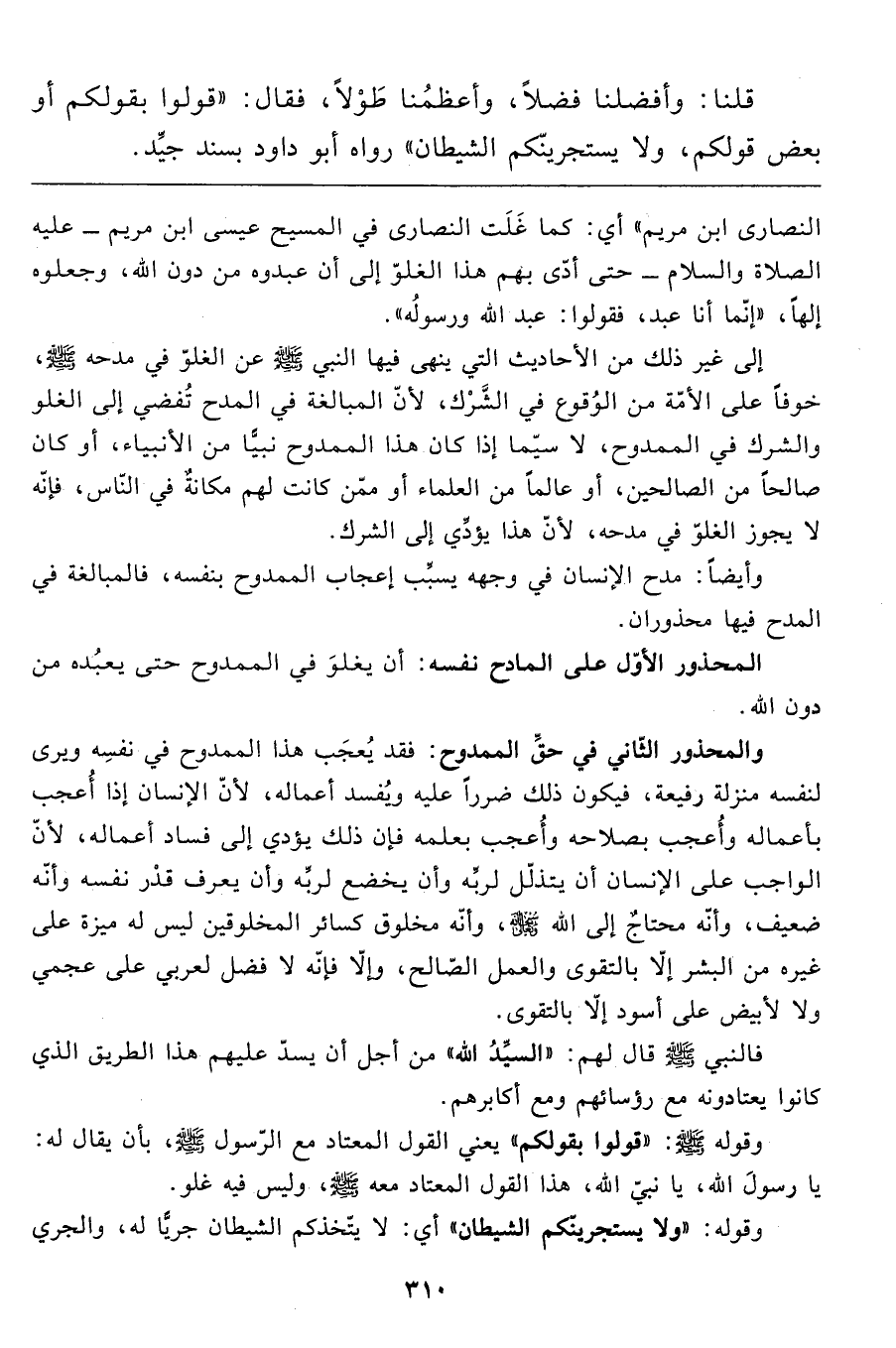 قلنا: وأفضلنا فضلاً، وأعظمُنا طَوْلاً، فقال: "قولوا بقولكم أو بعض قولكم، ولا يستجرينكم الشيطان" رواه أبو داود بسند جيِّد.