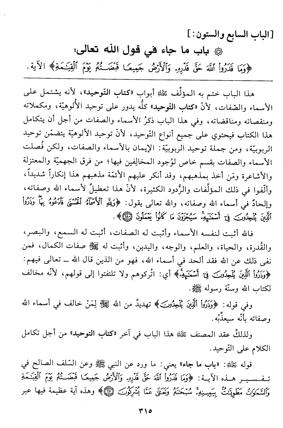 هذا الباب ختم به المؤلِّف رحمه الله أبواب "كتاب التّوحيد"، لأنه يشتمل على الأسماء والصّفات، لأنّ "كتاب التّوحيد" كلُّه يدور على توحيد الأُلوهيّة، ومكملاته ومنقصاته ومناقضاته، وفي هذا الباب ذكرُ الأسماء والصّفات من أجل أن يتكامل هذا الكتاب فيحتوي على جميع أنواع التّوحيد، لأنّ توحيد الألوهيّة يتضمّن توحيد الربوبيّة، ومن جملة توحيد الربوبيّة: الإيمان بالأسماء والصّفات، ولكن فُصلت الأسماء والصّفات بقسم خاص لوُجود المخالفين فيها؛ من فرق الجهميّة والمعتزلة والأشاعرة ومَن أخذ بمذهبهم، وقد أنكر عليهم الأئمّة مذهبهم هذا إنكاراً شديداً، وألّفوا في ذلك المؤلَّفات والرُّدود الكثيرة، لأنّ هذا تعطيلٌ لأسماء الله وصفاته، وإلحادٌ في أسماء الله وصفاته، والله تعالى يقول: {وَلِلَّهِ الْأَسْمَاءُ الْحُسْنَى فَادْعُوهُ بِهَا وَذَرُوا الَّذِينَ يُلْحِدُونَ فِي أَسْمَائِهِ سَيُجْزَوْنَ مَا كَانُوا يَعْمَلُونَ (180) } .