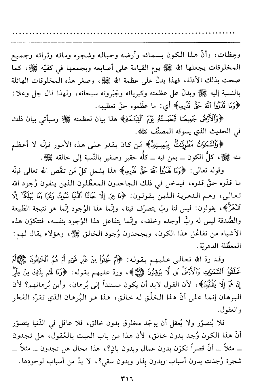 وقوله تعالى: {وَمَا قَدَرُوا اللهَ حَقَّ قَدْرِهِ} هذا يشمل كلّ من تنقّص الله تعالى فإنّه ما قدره حقّ قدره، فيدخل في ذلك الجاحدون المعطِّلون الذين ينفون وُجود الله تعالى، وهم الدهرية الذين يقولون: {مَا هِيَ إِلَّا حَيَاتُنَا الدُّنْيَا نَمُوتُ وَنَحْيَا وَمَا يُهْلِكُنَا إِلَّا الدَّهْرُ} ، يقولون: ليس لنا ربّ يتصرّف فينا، وإنّما هذا الوُجود إنّما هو نتيجة الطّبيعة والصُّدفة ليس له ربٌّ أوجده وخلقه، وإنّما يتفاعل هذا الوُجود بنفسه، فتتكوّن هذه الأشياء من تفاعُل هذا الكون، ويجحدون وُجود الخالق سبحانه وتعالى، وهؤلاء يقال لهم: المعطِّلة الدهريّة.