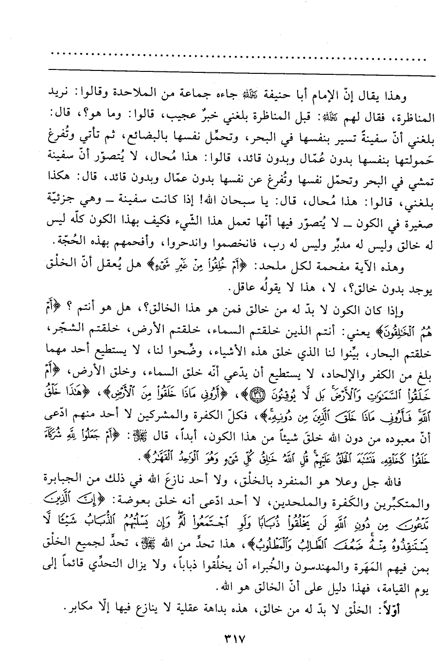 وهذا يقال إنّ الإمام أبا حنيفة رحمه الله جاءه جماعة من الملاحدة وقالوا: نريد المناظرة، فقال لهم رحمه الله: قبل المناظرة بلغني خبرٌ عجيب، قالوا: وما هو؟، قال: بلغني أنّ سفينةً تسير بنفسها في البحر، وتحمَّل نفسها بالبضائع، ثم تأتي وتُفرغ حَمولتها بنفسها بدون عُمّال وبدون قائد، قالوا: هذا مُحال، لا يُتصوّر أنّ سفينة تمشي في البحر وتحمّل نفسها وتُفرغ عن نفسها بدون عمّال وبدون قائد، قال: هكذا بلغني، قالوا: هذا مُحال، قال: يا سبحان الله! إذا كانت سفينة- وهي جزئيّة صغيرة في الكون- لا يُتصوّر فيها أنّها تعمل هذا الشّيء فكيف بهذا الكون كلّه ليس له خالق وليس له مدبِّر وليس له رب، فانخصموا واندحروا، وأفحمهم بهذه الحُجّة.