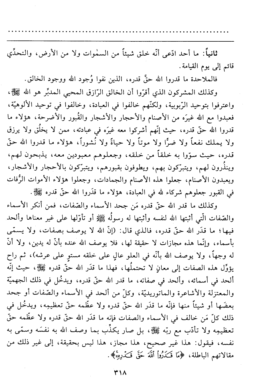 وكذلك ما قدر الله حقّ قدره مَن جحد الأسماء والصّفات، فمن أنكر الأسماء والصّفات الّتي أثبتها الله لنفسه وأثبتها له رسولُه صَلَّى اللَّهُ عَلَيْهِ وَسَلَّمَ أو تأوّلها على غير معناها وألحد فيها؛ ما قدَر الله حقّ قدره، فالذي قال: "إنّ الله لا يوصف بصفات، ولا يسمّى بأسماء، وإنّما هذه مجازات لا حقيقة لها، فلا يوصف الله عنده بأنّ له يدين، ولا أنّ له وجهاً، ولا يوصف الله بأنّه في العلو عالٍ على خلقه مستوٍ على عرشه"، ثم راح يؤوِّل هذه الصّفات إلى معانٍ لا تحتملُها، فهذا ما قدَر الله حقّ قدره سبحانه وتعالى، حيث إنّه ألحد في أسمائه، وألحد في صفاته، ما قدر الله حقّ قدره، ويدخُل في ذلك الجهميّة والمعتزلة والأشاعرة والماتوريديّة، وكلّ من ألحد في الأسماء والصّفات أو جحد بعضها أو شيئاً منها فإنّه ما قدَر الله حقّ قدره ولا عظّمه حقّ تعظيمه، ويدخل في ذلك كلّ من خالف في الأسماء والصّفات فإنّه ما قدَر الله حق قدره ولا عظّمه حق تعظيمه ولا تأدّب مع ربه سبحانه وتعالى، بل صار يكذِّب بما وصف الله به نفسه وسمّى به نفسه، فيقول: هذا غير صحيح، هذا مجاز، هذا ليس بحقيقة، إلى غير ذلك من مقالاتهم الباطلة، {وَمَا قَدَرُوا اللهَ حَقَّ قَدْرِهِ} .