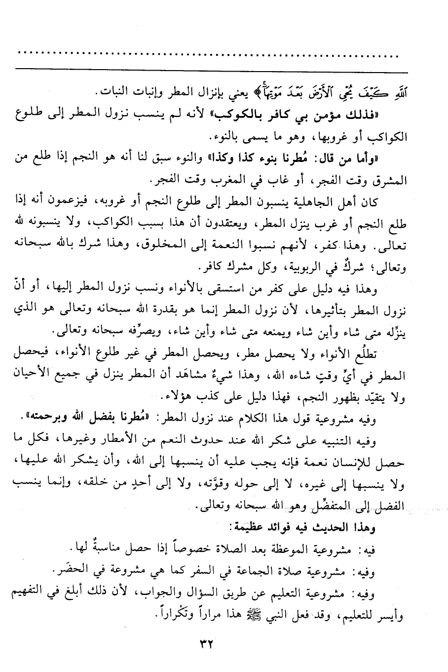 وهذا فيه دليل على كفر من استسقى بالأنواء ونسب نزول المطر إليها، أو أنّ نزول المطر بتأثيرها، لأن نزول المطر إنما هو بقدرة الله سبحانه وتعالى هو الذي ينزِّله متى شاء وأين شاء ويمنعه متى شاء وأين شاء، ويصرِّفه سبحانه وتعالى.