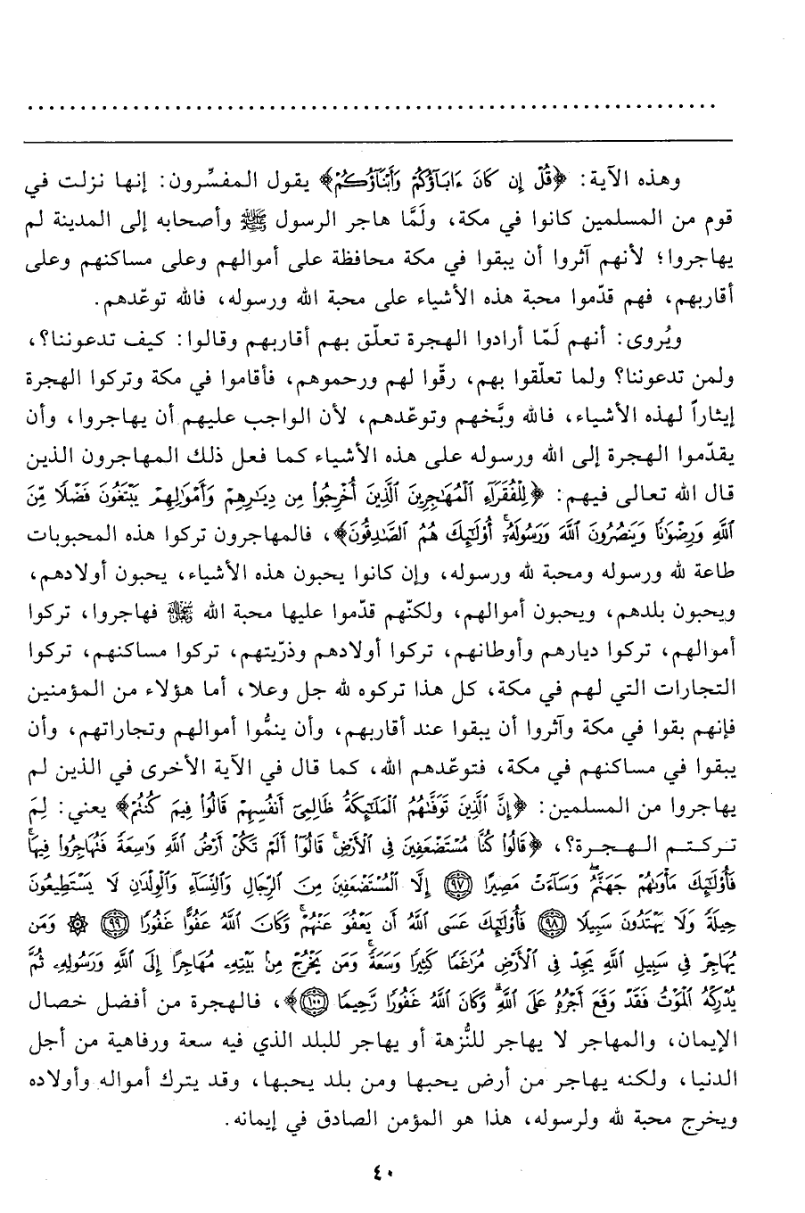 ويُروى: أنهم لَمّا أرادوا الهجرة تعلّق بهم أقاربهم وقالوا: كيف تدعوننا؟، ولمن تدعوننا؟ ولما تعلّقوا بهم، رقّوا لهم ورحموهم، فأقاموا في مكة وتركوا الهجرة إيثاراً لهذه الأشياء، فالله وبَّخهم وتوعّدهم، لأن الواجب عليهم أن يهاجروا، وأن يقدّموا الهجرة إلى الله ورسوله على هذه الأشياء كما فعل ذلك المهاجرون الذين قال الله تعالى فيهم: {لِلْفُقَرَاءِ الْمُهَاجِرِينَ الَّذِينَ أُخْرِجُوا مِنْ دِيَارِهِمْ وَأَمْوَالِهِمْ يَبْتَغُونَ فَضْلاً مِنَ اللهِ وَرِضْوَاناً وَيَنْصُرُونَ اللهَ وَرَسُولَهُ أُولَئِكَ هُمُ الصَّادِقُونَ} ، فالمهاجرون تركوا هذه المحبوبات طاعة لله ورسوله ومحبة لله ورسوله، وإن كانوا يحبون هذه الأشياء، يحبون أولادهم، ويحبون بلدهم، ويحبون أموالهم، ولكنهم قدّموا عليها محبة الله سبحانه وتعالى فهاجروا، تركوا أموالهم، تركوا ديارهم وأوطانهم، تركوا أولادهم وذرّيتهم، تركوا مساكنهم، تركوا التجارات التي لهم في مكة، كل هذا تركوه لله جل وعلا، أما هؤلاء من المؤمنين فإنهم بقوا في مكة وآثروا أن يبقوا عند أقاربهم، وأن ينمُّوا أموالهم وتجاراتهم، وأن يبقوا في مساكنهم في مكة، فتوعّدهم الله، كما قال في الآية الأخرى في الذين لم يهاجروا من المسلمين: {إِنَّ الَّذِينَ تَوَفَّاهُمُ الْمَلَائِكَةُ ظَالِمِي أَنْفُسِهِمْ قَالُوا فِيمَ كُنْتُمْ} يعني: لِمَ تركتم الهجرة؟، {قَالُوا كُنَّا مُسْتَضْعَفِينَ فِي الْأَرْضِ قَالُوا أَلَمْ تَكُنْ أَرْضُ اللهِ وَاسِعَةً فَتُهَاجِرُوا فِيهَا فَأُولَئِكَ مَأْوَاهُمْ جَهَنَّمُ وَسَاءَتْ مَصِيراً (97) إِلَّا الْمُسْتَضْعَفِينَ مِنَ الرِّجَالِ وَالنِّسَاءِ وَالْوِلْدَانِ لا يَسْتَطِيعُونَ حِيلَةً وَلا يَهْتَدُونَ سَبِيلاً (98) فَأُولَئِكَ عَسَى اللهُ أَنْ يَعْفُوَ عَنْهُمْ وَكَانَ اللهُ عَفُوّاً غَفُوراً (99) وَمَنْ يُهَاجِرْ فِي سَبِيلِ اللهِ يَجِدْ فِي الْأَرْضِ مُرَاغَماً كَثِيراً وَسَعَةً وَمَنْ يَخْرُجْ مِنْ بَيْتِهِ مُهَاجِراً إِلَى اللهِ وَرَسُولِهِ ثُمَّ يُدْرِكْهُ الْمَوْتُ فَقَدْ وَقَعَ أَجْرُهُ عَلَى اللهِ وَكَانَ اللهُ غَفُوراً رَحِيماً (100) } ، فالهجرة من أفضل خصال الإيمان، والمهاجر لا يهاجر للنُّزهة أو يهاجر للبلد الذي فيه سعة ورفاهية من أجل الدنيا، ولكنه يهاجر من أرض يحبها ومن بلد يحبها، وقد يترك أمواله وأولاده ويخرج محبة لله ولرسوله، هذا هو المؤمن الصادق في إيمانه.