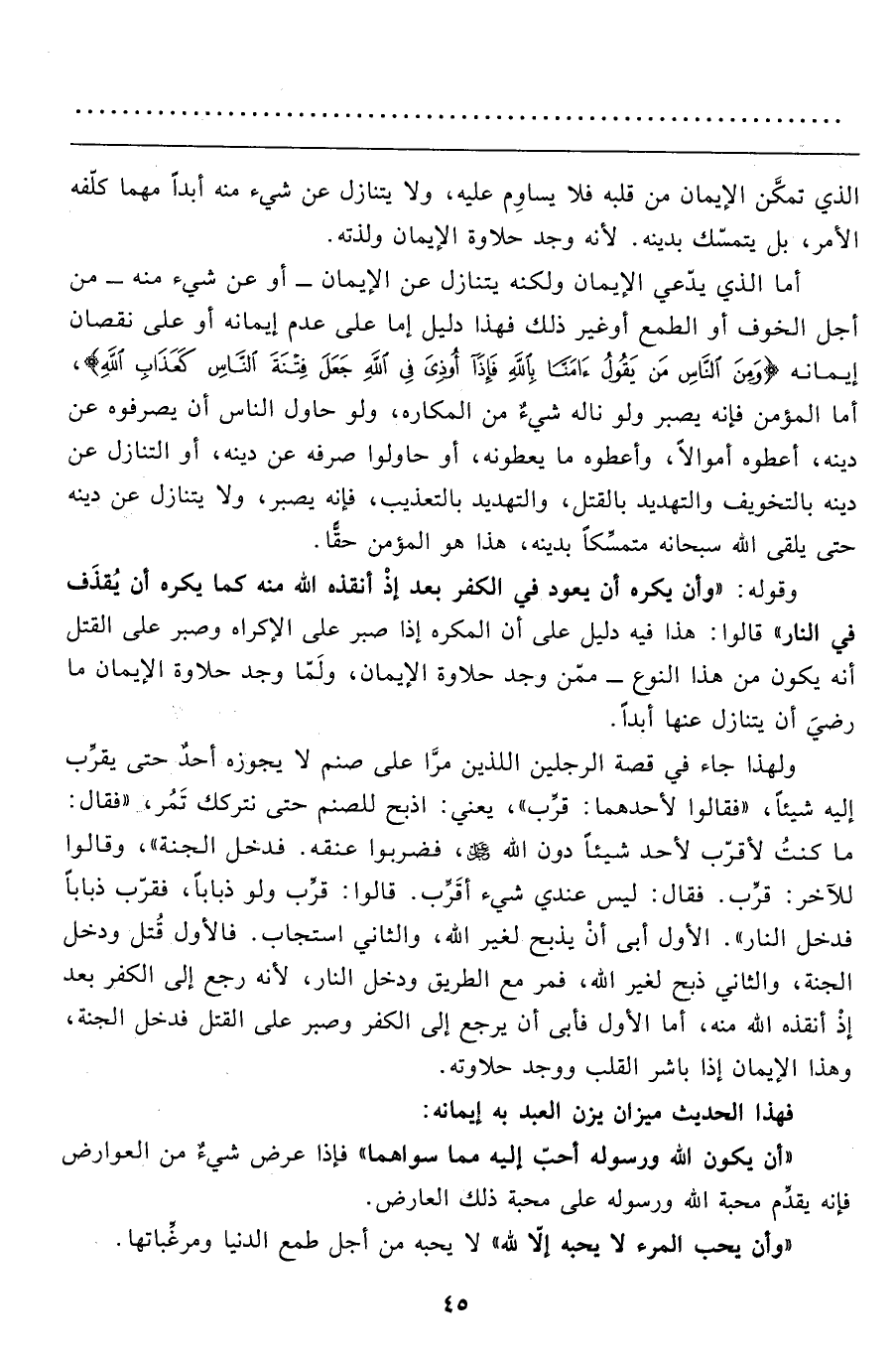 ولهذا جاء في قصة الرجلين اللذين مرَّا على صنم لا يجوزه أحدٌ حتى يقرِّب إليه شيئاً، "فقالوا لأحدهما: قرِّب"، يعني: اذبح للصنم حتى نتركك تَمُر، "فقال: ما كنتُ لأقرّب لأحد شيئاً دون الله عزّ وجلّ، فضربوا عنقه. فدخل الجنة"، وقالوا للآخر: قرِّب. فقال: ليس عندي شيء أقَرِّب. قالوا: قرِّب ولو ذباباً، فقرّب ذباباً فدخل النار". الأول أبى أنْ يذبح لغير الله، والثاني استجاب. فالأول قُتل ودخل الجنة، والثاني ذبح لغير الله، فمر مع الطريق ودخل النار، لأنه رجع إلى الكفر بعد إذْ أنقذه الله منه، أما الأول فأبى أن يرجع إلى الكفر وصبر على القتل فدخل الجنة، وهذا الإيمان إذا باشر القلب ووجد حلاوته.