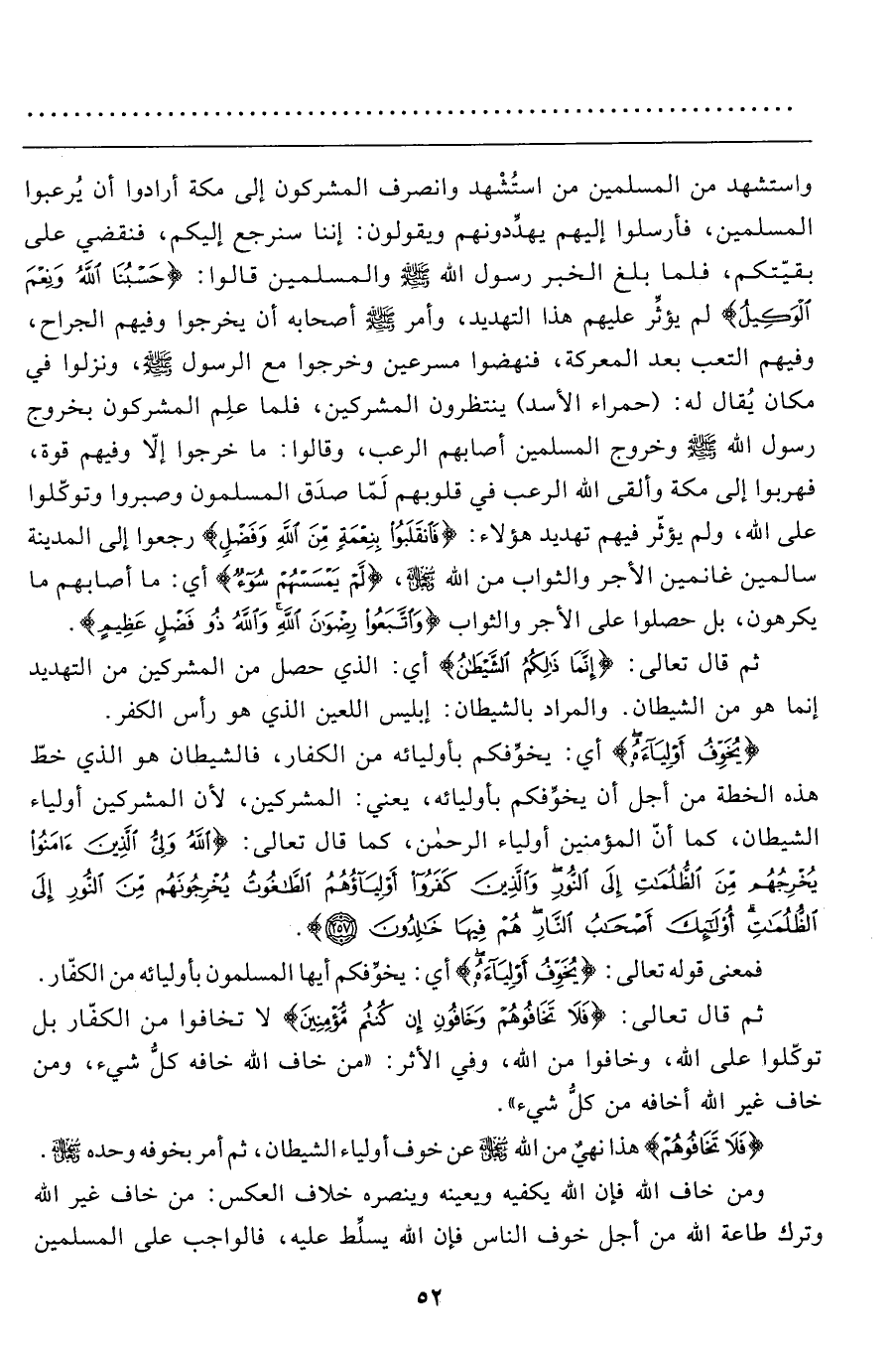 {يُخَوِّفُ أَوْلِيَاءَهُ} أي: يخوِّفكم بأوليائه من الكفار، فالشيطان هو الذي خطّ هذه الخطة من أجل أن يخوِّفكم بأوليائه، يعني: المشركين، لأن المشركين أولياء الشيطان، كما أن المؤمنين أولياء الرحمن، كما قال تعالى: {اللهُ وَلِيُّ الَّذِينَ آمَنُوا يُخْرِجُهُمْ مِنَ الظُّلُمَاتِ إِلَى النُّورِ وَالَّذِينَ كَفَرُوا أَوْلِيَاؤُهُمُ الطَّاغُوتُ يُخْرِجُونَهُمْ مِنَ النُّورِ إِلَى الظُّلُمَاتِ أُولَئِكَ أَصْحَابُ النَّارِ هُمْ فِيهَا خَالِدُونَ (257) } .