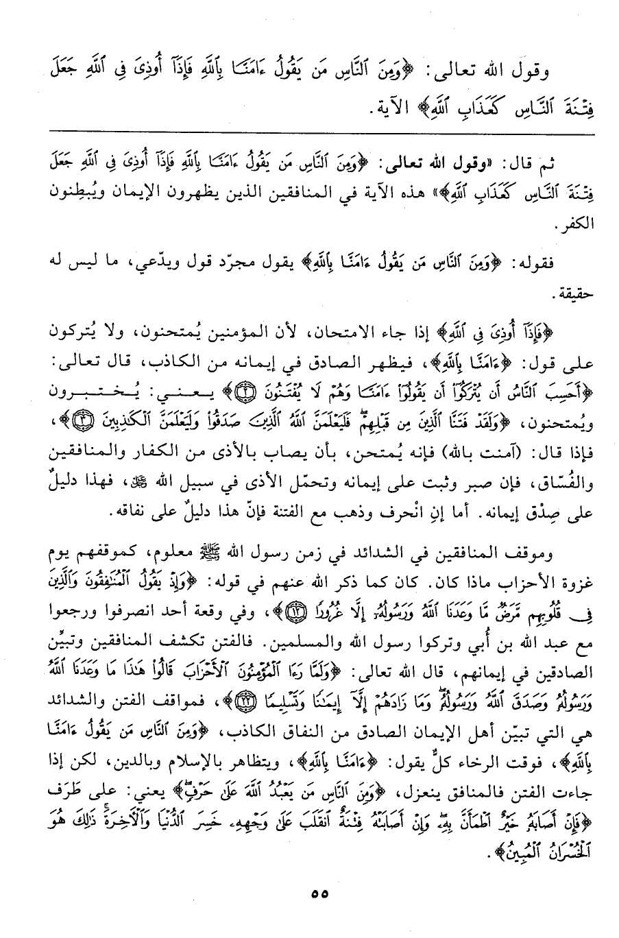 ثمّ قال: "وقول الله تعالى: {وَمِنَ النَّاسِ مَنْ يَقُولُ آمَنَّا بِاللهِ فَإِذَا أُوذِيَ فِي اللهِ جَعَلَ فِتْنَةَ النَّاسِ كَعَذَابِ اللهِ} هذه الآية في المنافقين الذين يظهرون الإيمان ويُبطِنون الكفر.