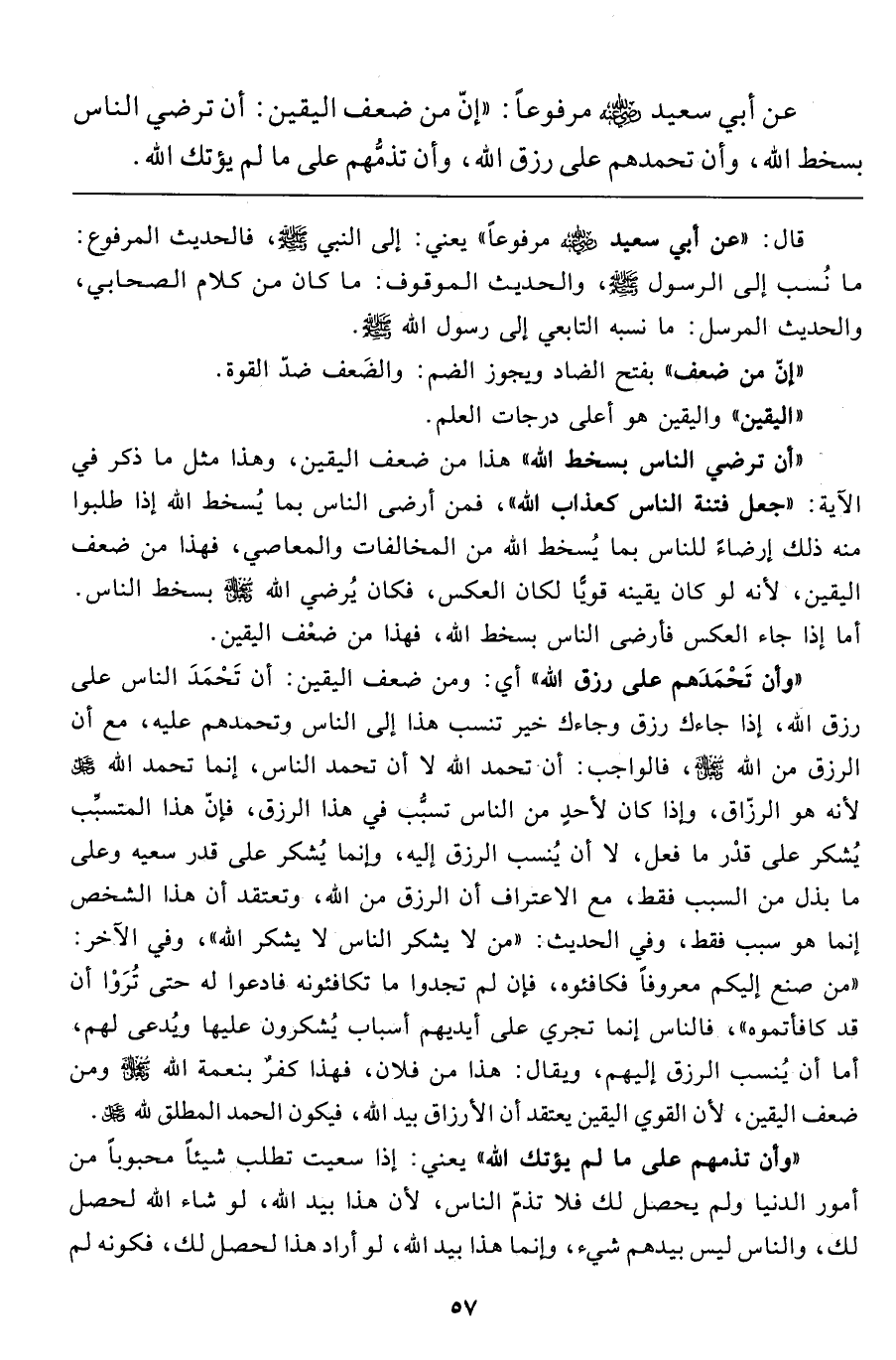 عن أبي سعيد رضي الله عنه مرفوعاً: "إنّ من ضعف اليقين: أن ترضي النّاس بسخط الله، وأن تحمدهم على رزق الله، وأن تذمُّهم على ما لم يؤتك الله.