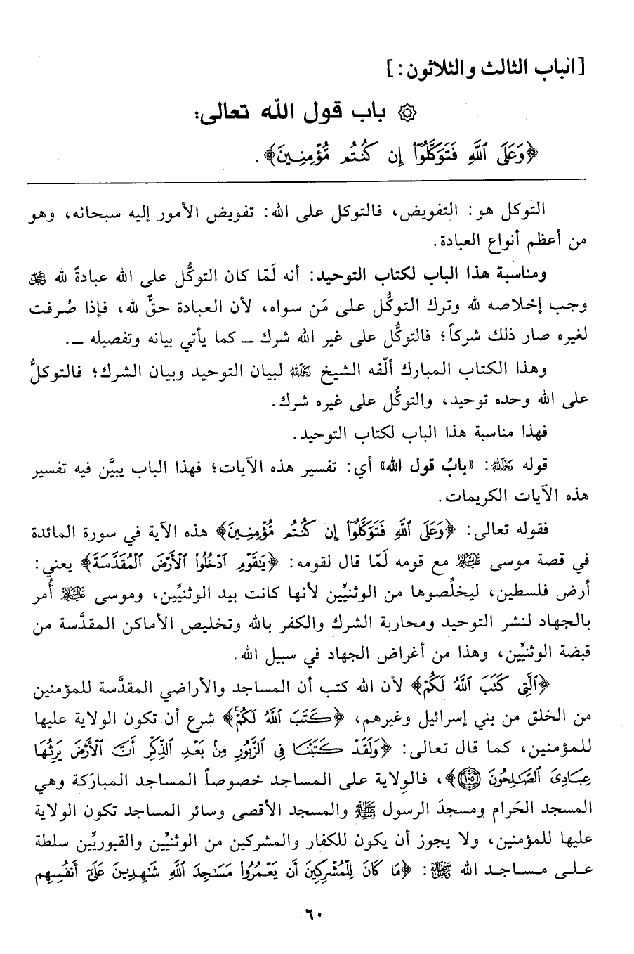 وهذا الكتاب المبارك ألّفه الشيخ رحمه الله لبيان التّوحيد وبيان الشرك؛ فالتوكلُّ على الله وحده توحيد، والتوكُّل على غيره شرك.