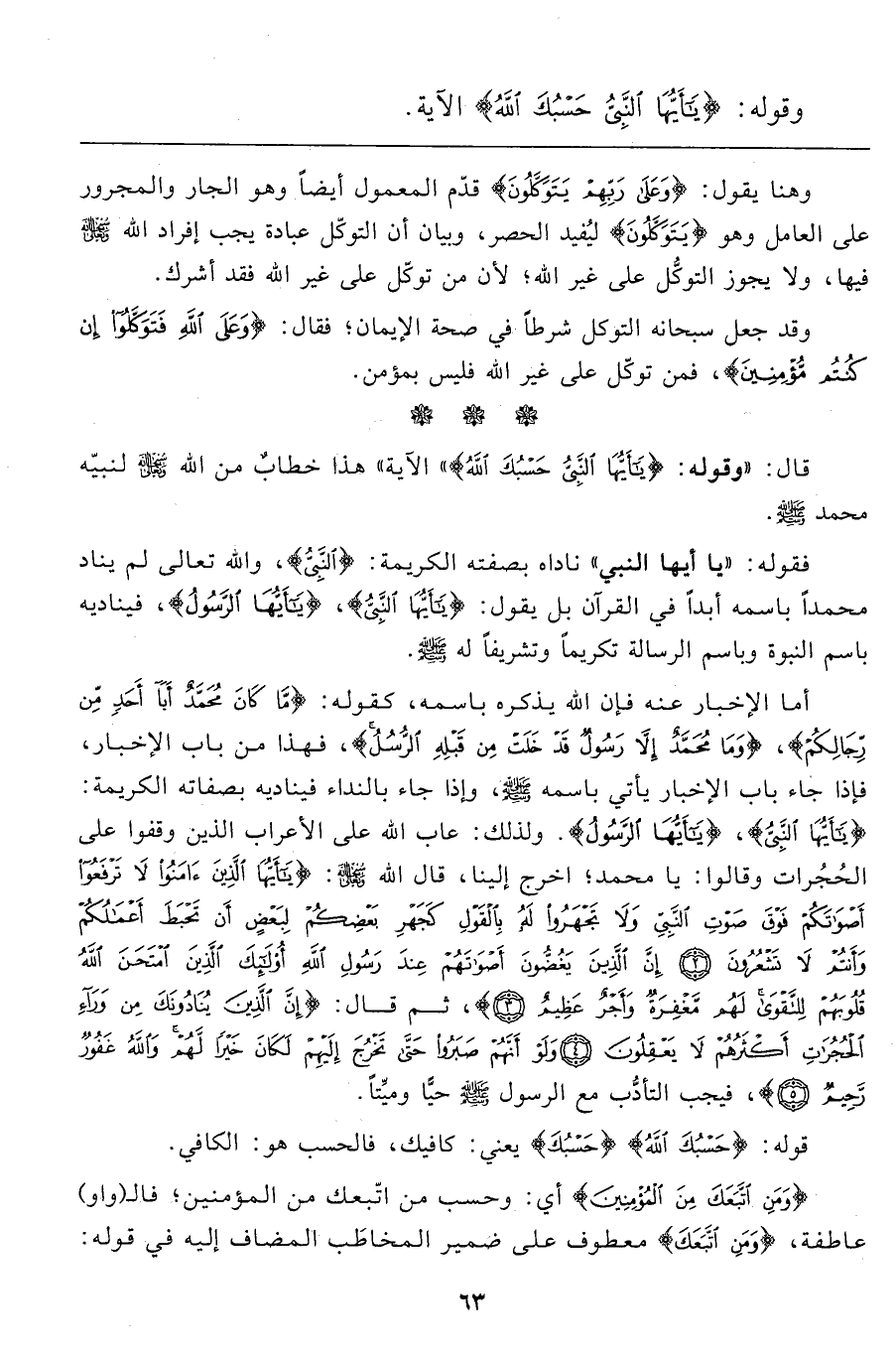 قال: "وقوله: {يَا أَيُّهَا النَّبِيُّ حَسْبُكَ اللهُ} الآية" هذا خطاب من الله سبحانه وتعالى لنبيّه محمد صَلَّى اللَّهُ عَلَيْهِ وَسَلَّمَ.