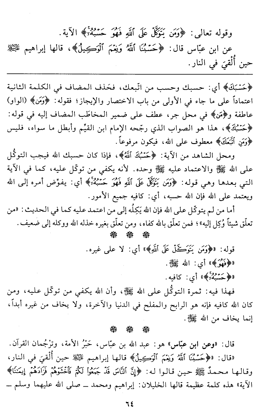 ومحل الشاهد من الآية: {حَسْبُكَ اللهُ} ، فإذا كان حسبك الله فيجب التوكُّل على الله سبحانه وتعالى والاعتماد عليه سبحانه وتعالى وحده. لأنه يكفي من توكّل عليه، كما في الآية التي بعدها وهي قوله: {وَمَنْ يَتَوَكَّلْ عَلَى اللهِ فَهُوَ حَسْبُهُ} أي: يفوِّض أمره إلى الله ويعتمد على الله فإن الله حسبه، أي: كافيه جميع الأمور.