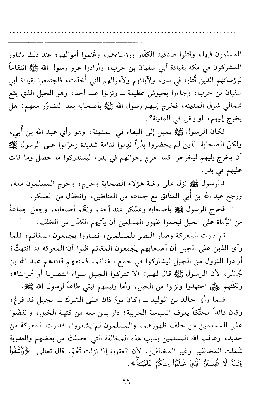 فلما رأى خالد بن الوليد- وكان يومَ ذاك على الشرك- الجبل قد فرغ، وكان قائداً محنَّكاً يعرف السياسة الحربية؛ دار بمن معه من كتيبة الخيل، وانقضّوا على المسلمين من خلف ظهورهم، والمسلمون لم يشعروا، فدارت المعركة من جديد، وعاقب الله المسلمين بسبب هذه المخالفة التي حصلتْ من بعضهم والعقوبة شملت المخالفين وغير المخالفين، لأن العقوبة إذا نزلت تَعُمّ، قال تعالى: {وَاتَّقُوا فِتْنَةً لا تُصِيبَنَّ الَّذِينَ ظَلَمُوا مِنْكُمْ خَاصَّةً} .