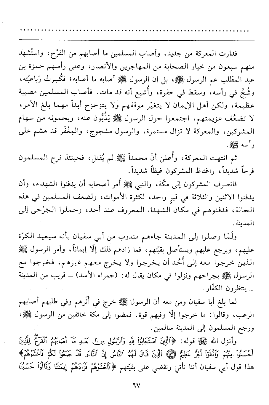 وأنزل الله سبحانه وتعالى قوله: {الَّذِينَ اسْتَجَابُوا لِلَّهِ وَالرَّسُولِ مِنْ بَعْدِ مَا أَصَابَهُمُ الْقَرْحُ لِلَّذِينَ أَحْسَنُوا مِنْهُمْ وَاتَّقَوْا أَجْرٌ عَظِيمٌ (172)) الَّذِينَ قَالَ لَهُمُ النَّاسُ إِنَّ النَّاسَ قَدْ جَمَعُوا لَكُمْ فَاخْشَوْهُمْ} .