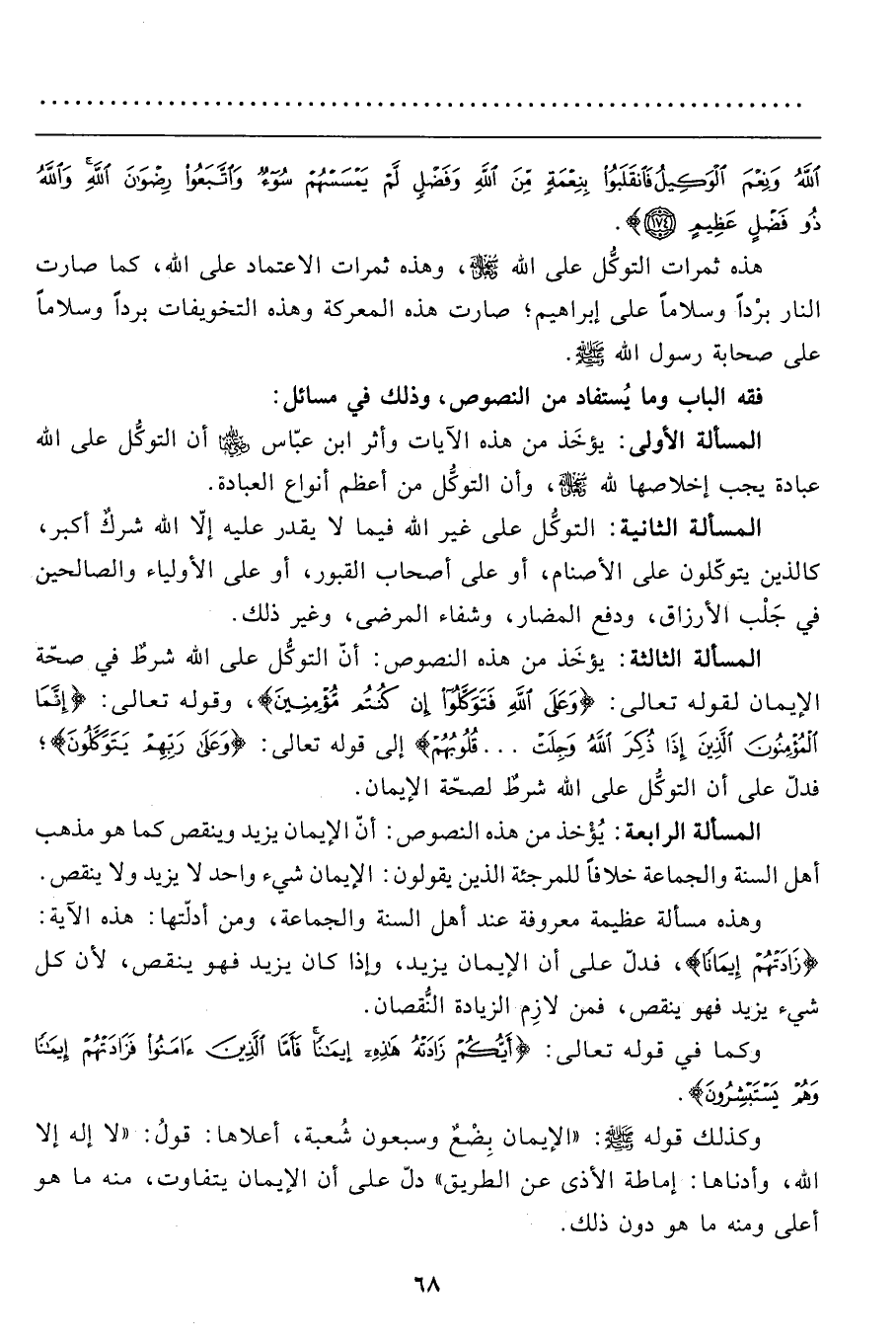 المسألة الرابعة: يُؤْخذ من هذه النصوص: أن الإيمان يزيد وينقص كما هو مذهب أهل السنّة والجماعة خلافاً للمرجئة الذين يقولون: الإيمان شيء واحد لا يزيد ولا ينقص.