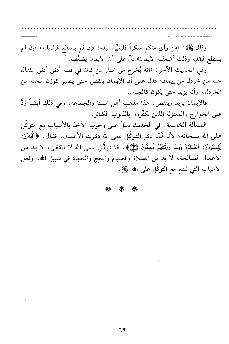 المسألة الخامسة: في الحديث دليلٌ على وجوب الأخذ بالأسباب مع التوكُّل على الله سبحانه؛ لأنه لَمّا ذكر التوكُّل على الله ذكرت الأعمال، فقال: {الَّذِينَ يُقِيمُونَ الصَّلاةَ وَمِمَّا رَزَقْنَاهُمْ يُنْفِقُونَ (3) } ، فالتوكُّل على الله لا يكفي، لا بد من الأعمال الصالحة، لا بد من الصلاة والصيام والحج والجهاد في سبيل الله، وفعل الأسباب التي تنفع مع التوكُّل على الله سبحانه وتعالى.