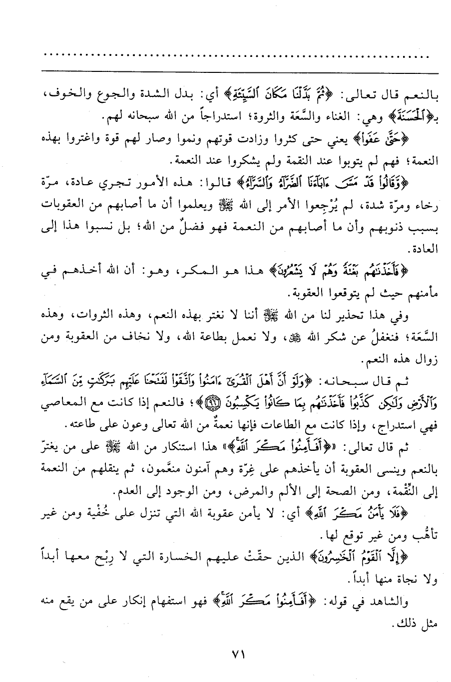 بالنعم قال تعالى: {ثُمَّ بَدَّلْنَا مَكَانَ السَّيِّئَةِ} أي: بدل الشدة والجوع والخوف، بـ {الْحَسَنَةَ} وهي: الغناء والسَّعَة والثروة؛ استدراجاً من الله سبحانه لهم.