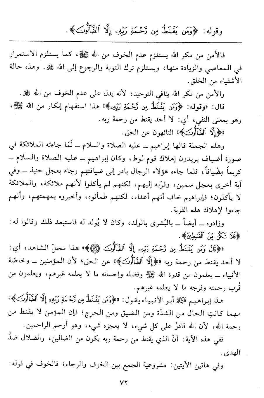 هذا إبراهيم عليه السلام أبو الأنبياء يقول: " {وَمَنْ يَقْنَطُ مِنْ رَحْمَةِ رَبِّهِ إِلَّا الضَّالُّونَ} " مهما كانتِ الحال من الشدّة ومن الضيق ومن الحرج؛ فإن المؤمن لا يقنط من رحمة الله، لأن الله قادرٌ على كل شيء، لا يعجزه شيء، وهو أرحم الراحمين.